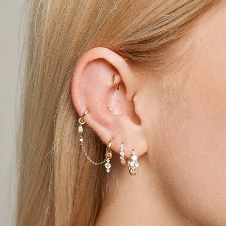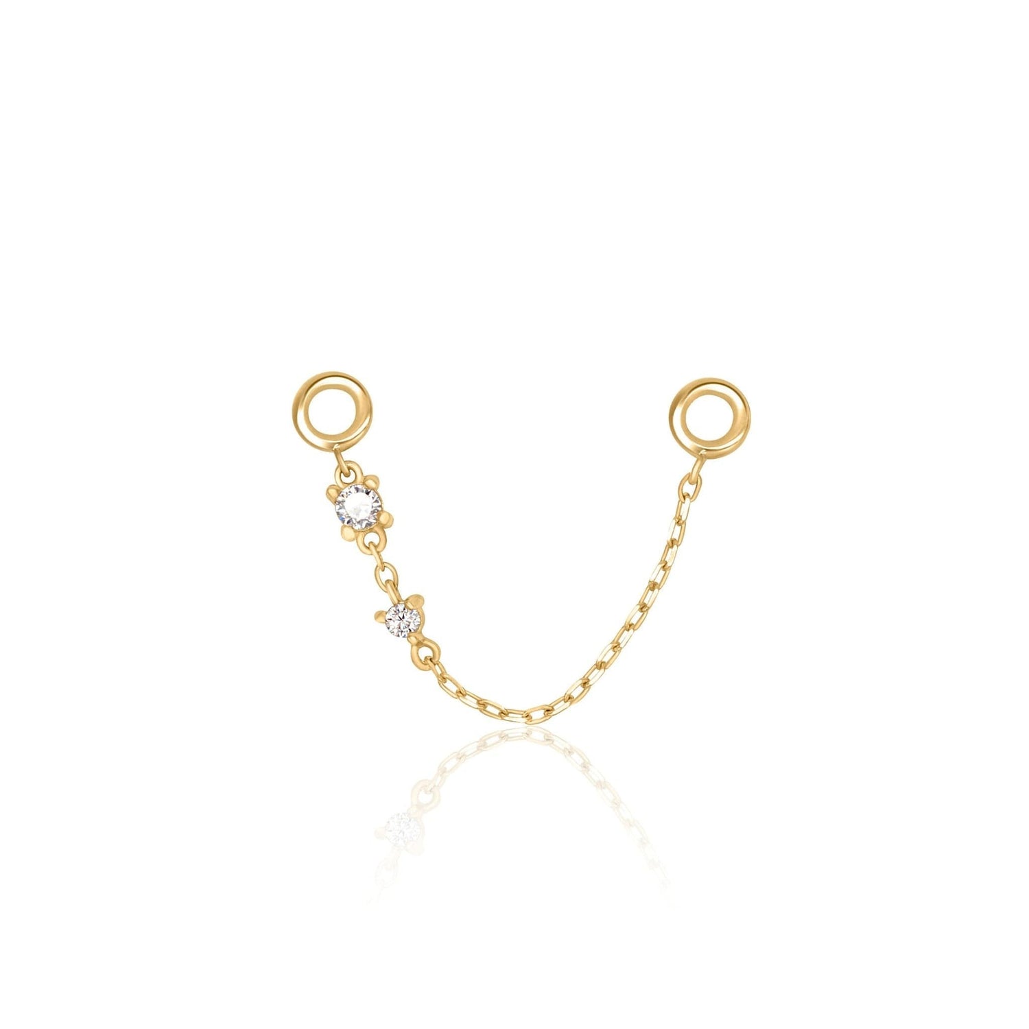 At the heart of the Lisa Eleni brand is a founding couple from Vienna and their shared passion for fine jewelry. Lisa serves as creative designer, bringing her artistic touch, while Thomas oversees finances and marketing. Together, they have built a brand that stands for unique design and enduring gold jewelry. Lisa Eleni aims for their affordable yet high-quality pieces to maintain their shine for a lifetime. All jewelry is made in small batches.Style notes: The Helix Chain Earring you can style individually and uniquely. It can be hooked into our Huggies and connect two Huggies together. But it can also be hooked into an ear stud, either as a connection to another earring, or just into the ear stud. For this, it is hooked at the front and back of the stud and is perfect as a Helix Chain Earring. Also in the Lobe, High-Lobe Piercing or Mid-Helix Piercing it is an absolute eye-catcher. The crystal chain charm fits very well in Celestial Ear stacks because of the sparkling crystals. It can be perfectly combined with the crystal stud earrings or the crystal Huggie.Price: Please note price may vary due to exchange rate differences or shipping, duties and taxes. Price may also vary with materials choice. Final price is calculated at checkout at the designer's website. Materials: Available in 14k yellow or white gold with cubic zirconia.Dimensions: Ring size - 2mm, Chain length - 3cm.