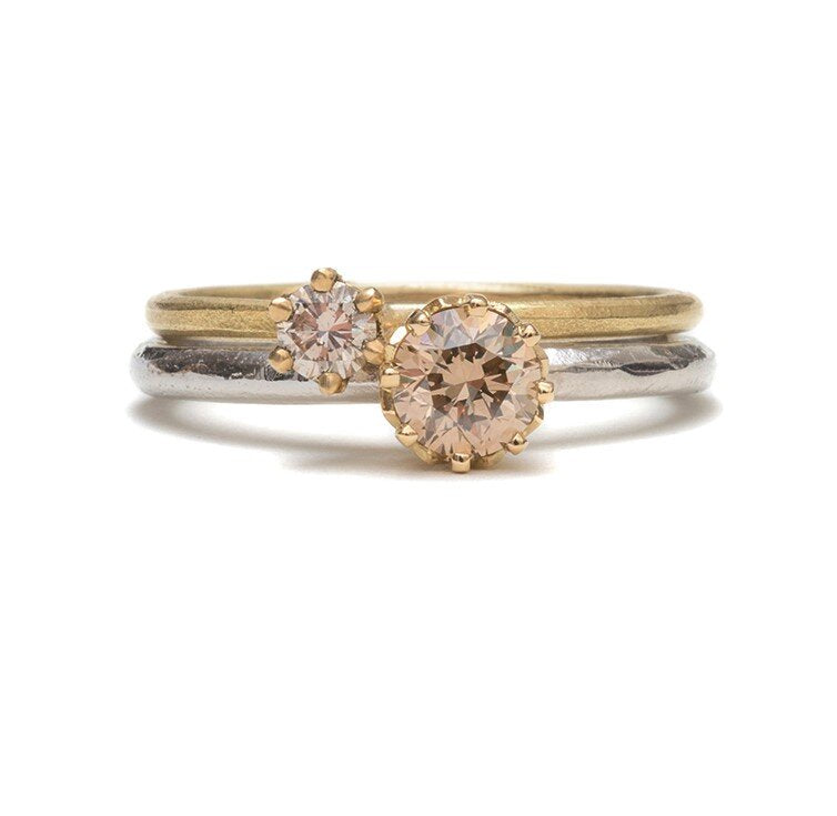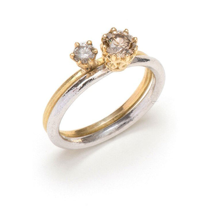 This beautiful set, created from textured and hand formed 18k yellow and white gold, features two lovely warm claw set champagne diamonds.