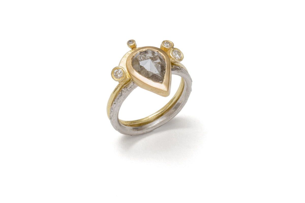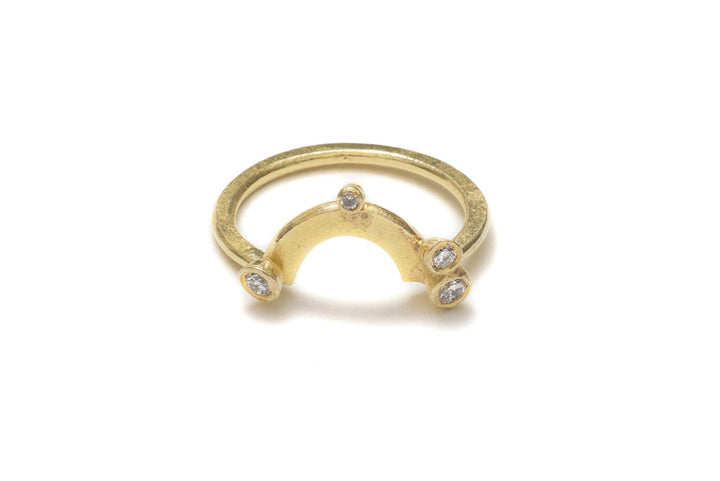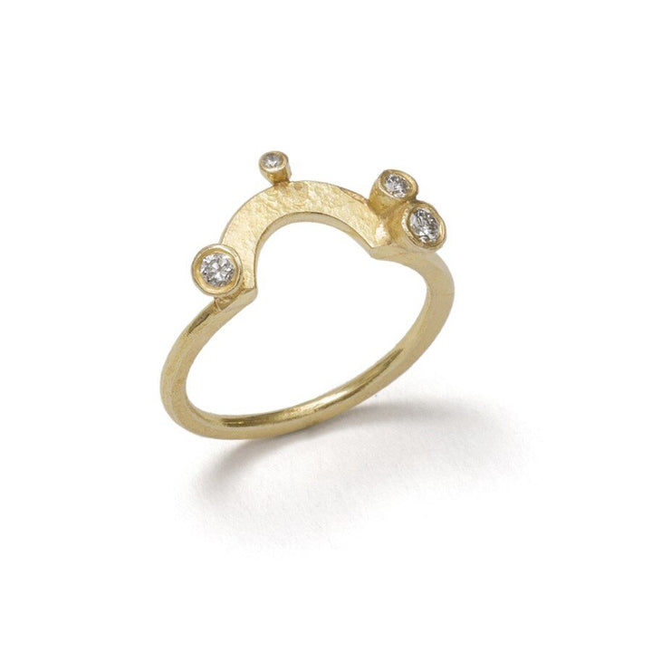 This beautifully elegant ring hand formed from textured 18k gold wire, is set with 4 round brilliant cut diamonds across the top section of the band. This design can be constructed to sit with any of Shimara's engagement rings.