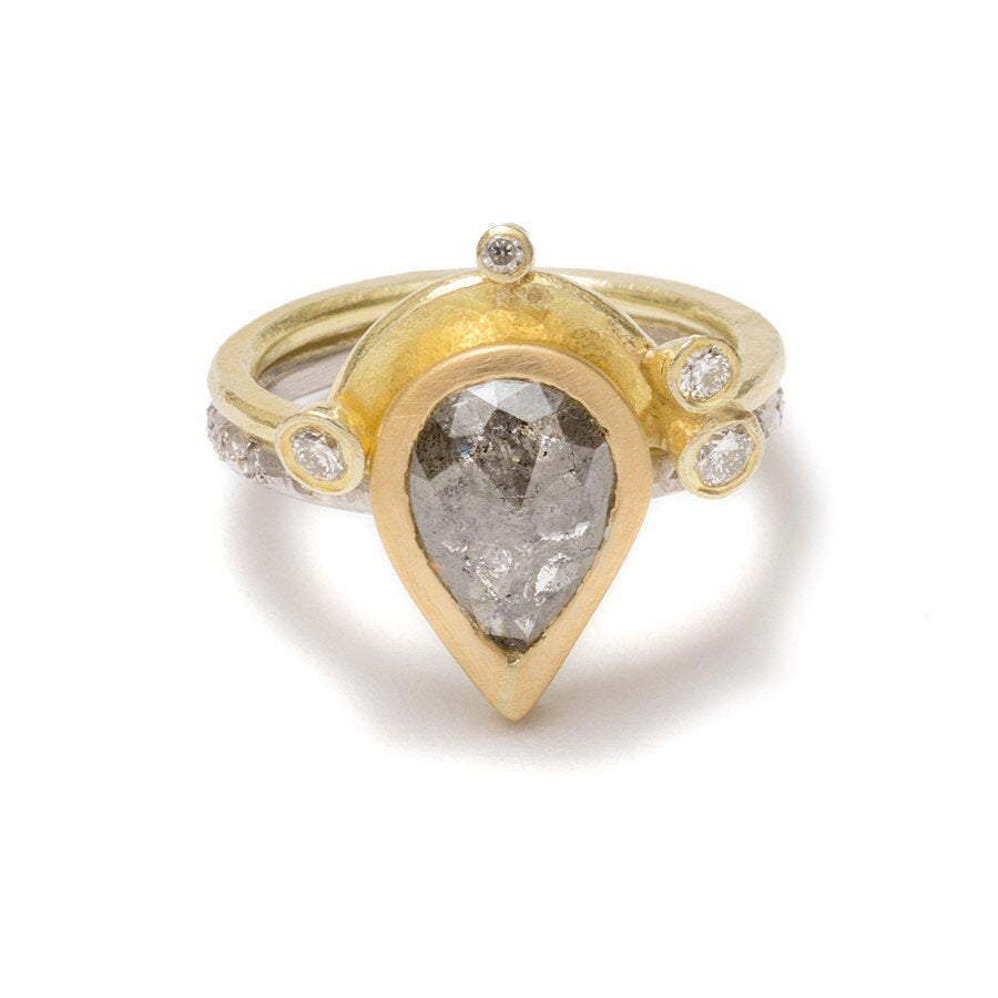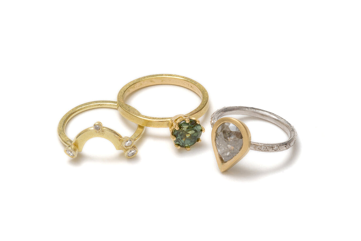 Shimara's work has been inspired by natural forms, primarily seed pods. She uses silver, 18k gold, gum nuts and a dazzling array of precious stones to create her tactile jewellery. While keeping her organic style, Shimara has created a simple yet unique collection of precious rings, including a range of wedding and engagement rings, some incorporating elements of her stacking rings, all combining subtle texture with a variety of stones in rich beautiful colours, particularly greys, blues and greens.