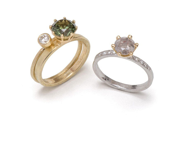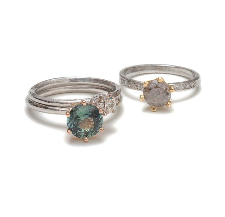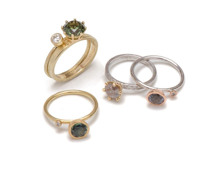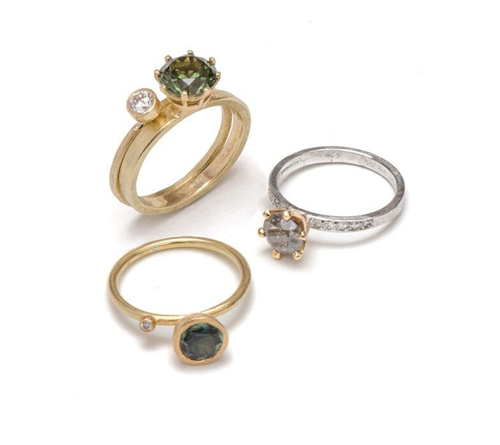 Shimara's work has been inspired by natural forms, primarily seed pods. She uses silver, 18k gold, gum nuts and a dazzling array of precious stones to create her tactile jewellery. While keeping her organic style, Shimara has created a simple yet unique collection of precious rings, including a range of wedding and engagement rings, some incorporating elements of her stacking rings, all combining subtle texture with a variety of stones in rich beautiful colours, particularly greys, blues and greens.