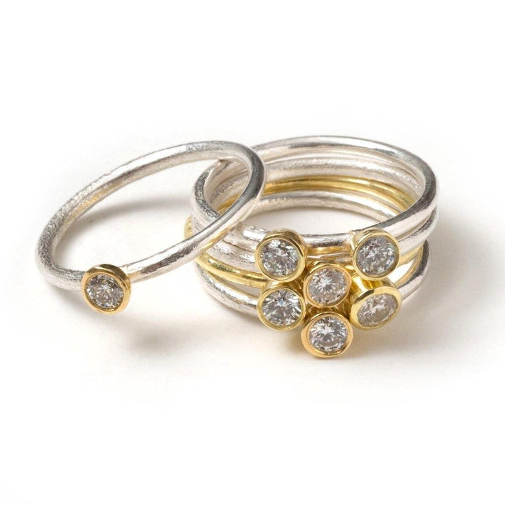The rings in Shimara's precious stacking range are inspired by clusters of pods and flowers. This stunning ring stack features round brilliant cut diamonds set in gold gum nuts on reticulated and hand formed silver and 18k gold bands. Wonderfully versatile, these rings can be worn in a variety of ways.