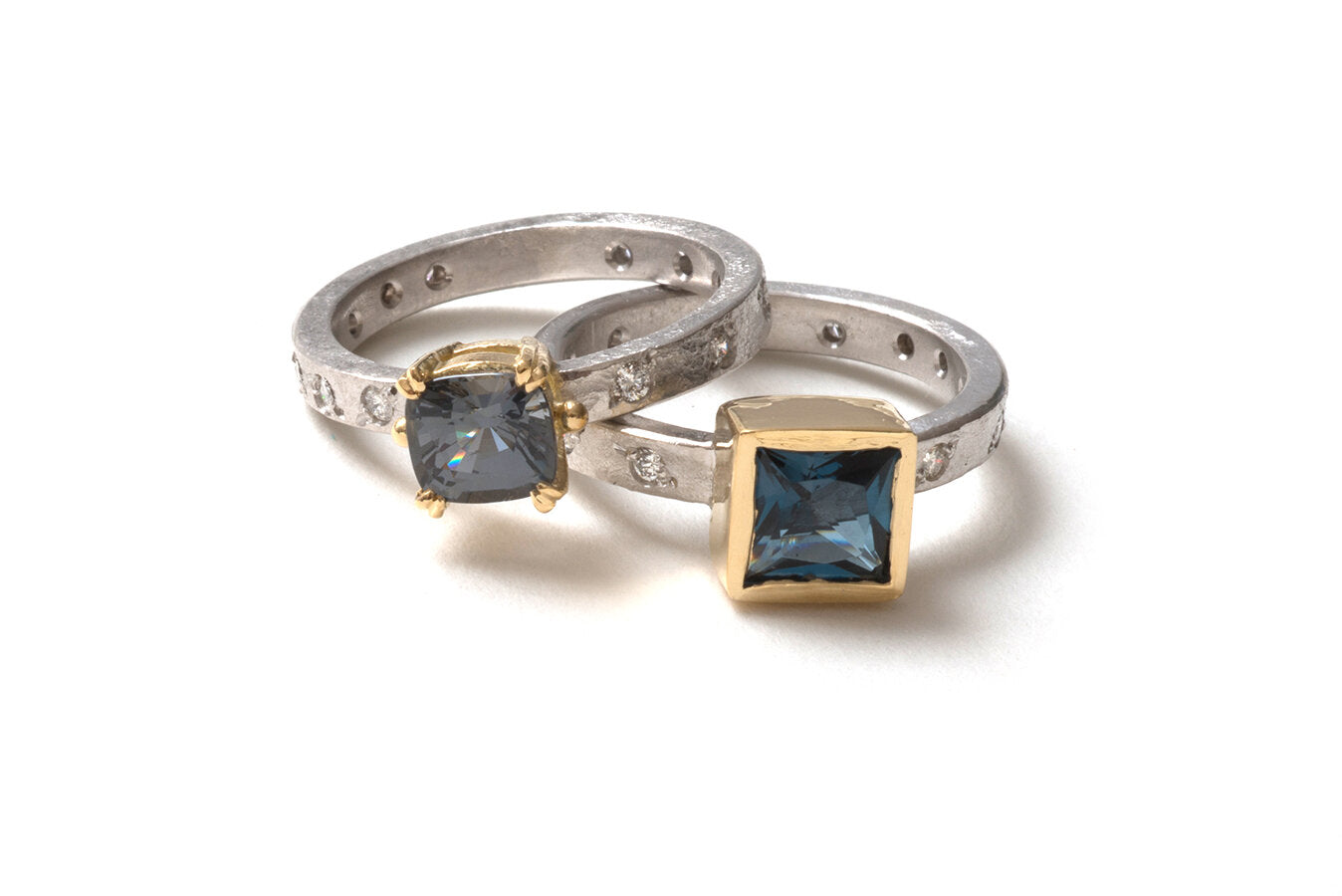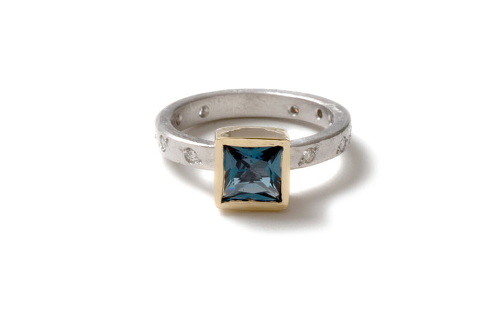 Created from textured and hand formed 18k white and yellow gold, this is a real statement ring featuring a big princess cut London blue topaz. The dark blue contrasts beautifully with the warm 18k yellow gold setting. Eleven round brilliant cut scattered diamonds add sparkle to the white gold band.