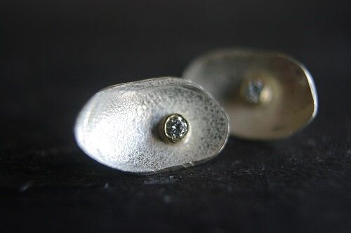 These gorgeous earrings are created from textured and hand formed silver petals, collet set with lovely round brilliant cut diamonds. Beautifully simple and elegant, they are a perfect choice for every occasion.