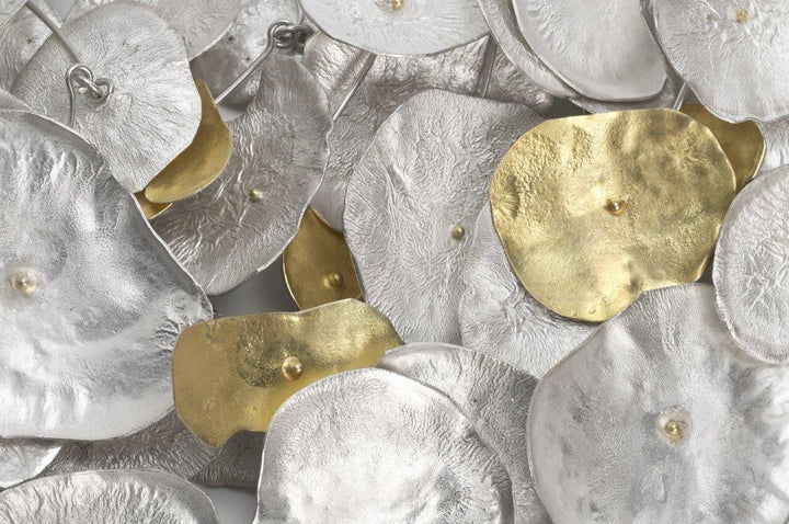 The Honesty collection was inspired by plant studies in Shimara's mother's Scottish garden. This statement piece features reticulated and formed, whitened leaves of silver and gold, each with gold bead centres, assembled into a stunning neckpiece.