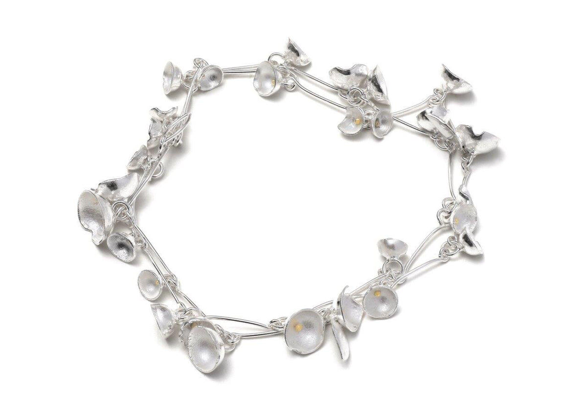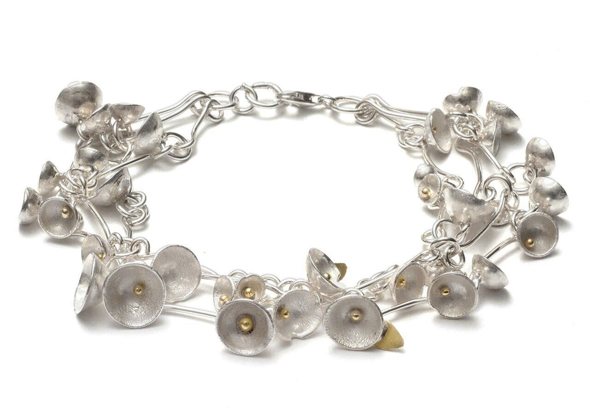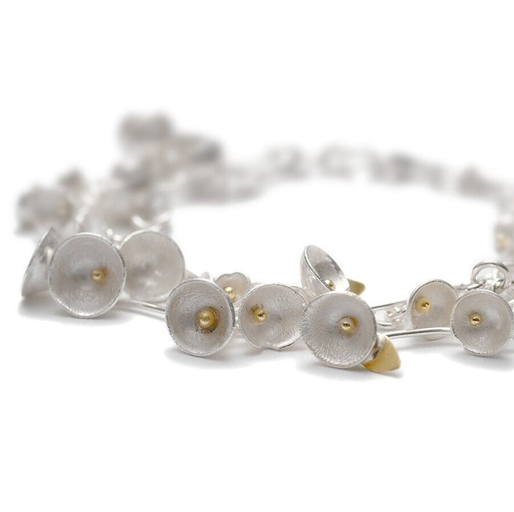 Made in sterling silver and 18k gold.Dimensions: 60 cm in total length. The bracelet comes in 2 sizes, the medium has larger cups and silver leaves, while the smaller has 18k gold leaves and smaller cups, they are both the same length.