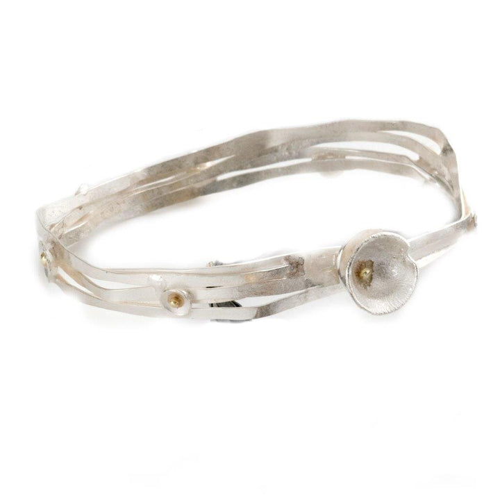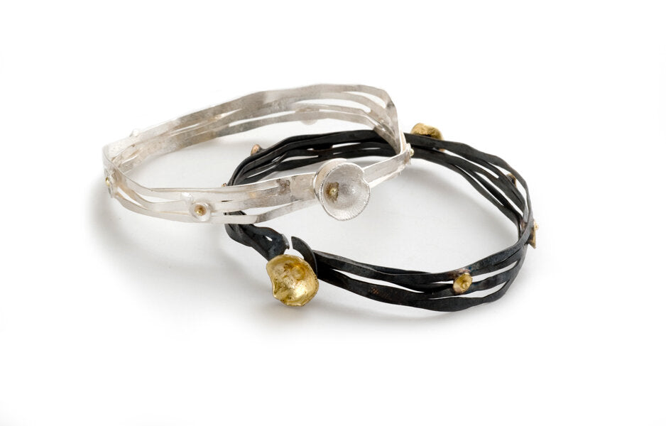 Featuring hammered and textured silver wire wrapped and woven into a nest before being set with eight gold centred acorn cups, this unique bracelet is beautifully simple and elegant.