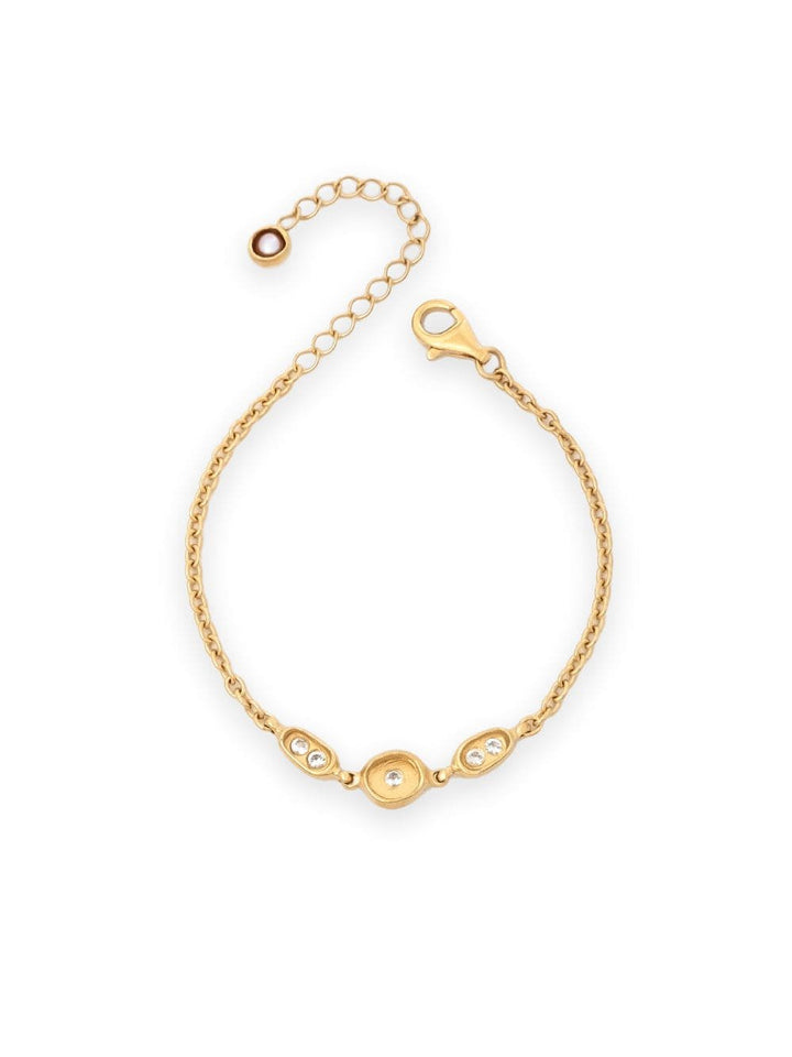 Adorn your wrist with the Dewdrop Bracelet, a testament to simplicity and elegance. This bracelet showcases sparkly white topaz nestled within a trio of sculptural morning dewdrops, creating a subtle yet captivating charm. Crafted with reversible beauty in mind, the pebble station feature is flexible, offering a delightful view from both sides. For those with an eye for details, the extender chain's final piece features a pink pearl pod, adding an extra touch of grace.