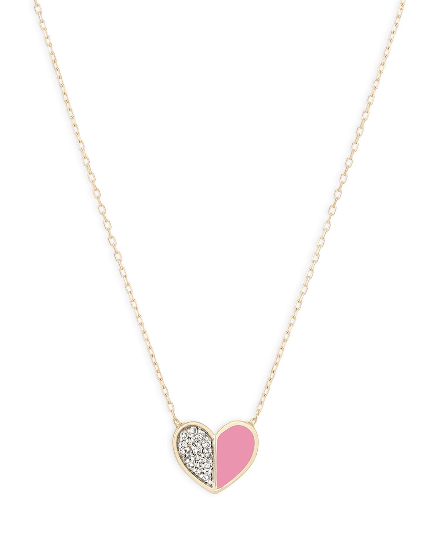 This 14K Yellow Gold Ceramic Diamond Folded Heart Pendant Necklace, 16' by Adina Reyter offers a unique and colorful twist with its half-pavé diamond and half-ceramic heart design. A vibrant addition to any jewelry collection, perfect for adding a playful yet elegant touch.