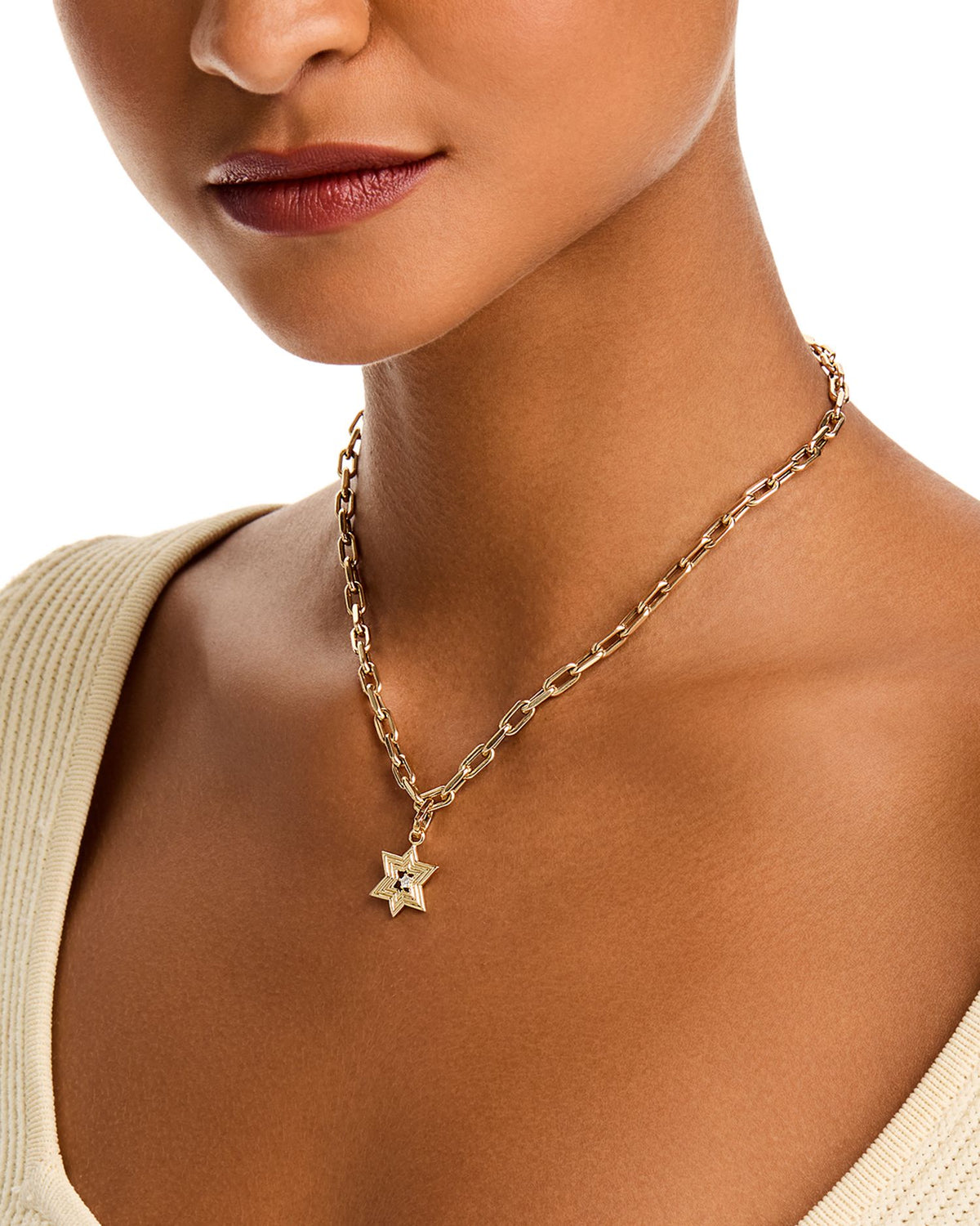 This 14K Yellow Gold Diamond Star of David Pendant by Adina Reyter combines meaningful symbolism with a touch of elegance. The grooved design is accented by a small, sparkling diamond, making it a standout piece for any collection.