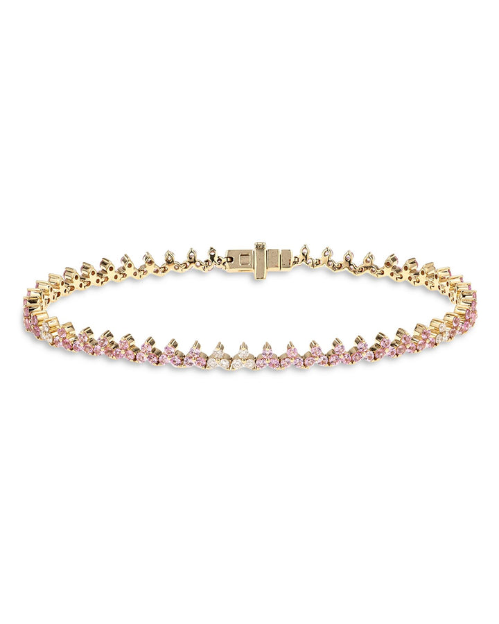 This 14K Yellow Gold Pink Sapphire & Diamond Tennis Bracelet by Adina Reyter pairs the soft glow of pastel pink sapphires with the brilliance of diamonds, creating an exquisite piece that exudes romance and luxury.