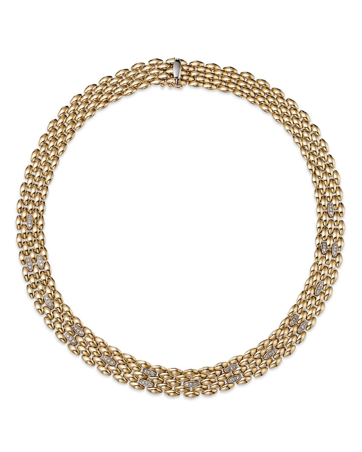 Handcrafted in 14K yellow gold and 14K white gold (or all 14K white gold), with diamonds totaling 0.57 carats (SI clarity). Measures 18' in length. Features a box clasp with figure-eight closure for secure wear. White gold is surface-coated with rhodium to enhance shine and may require replating over time. Made in Italy.