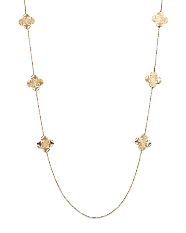 This 14K Yellow Gold Flower Statement Necklace by Alberto Amati combines elegance and artistry with its textured floral motifs. The long 27-inch length makes it perfect for layering or as a dramatic standalone piece.