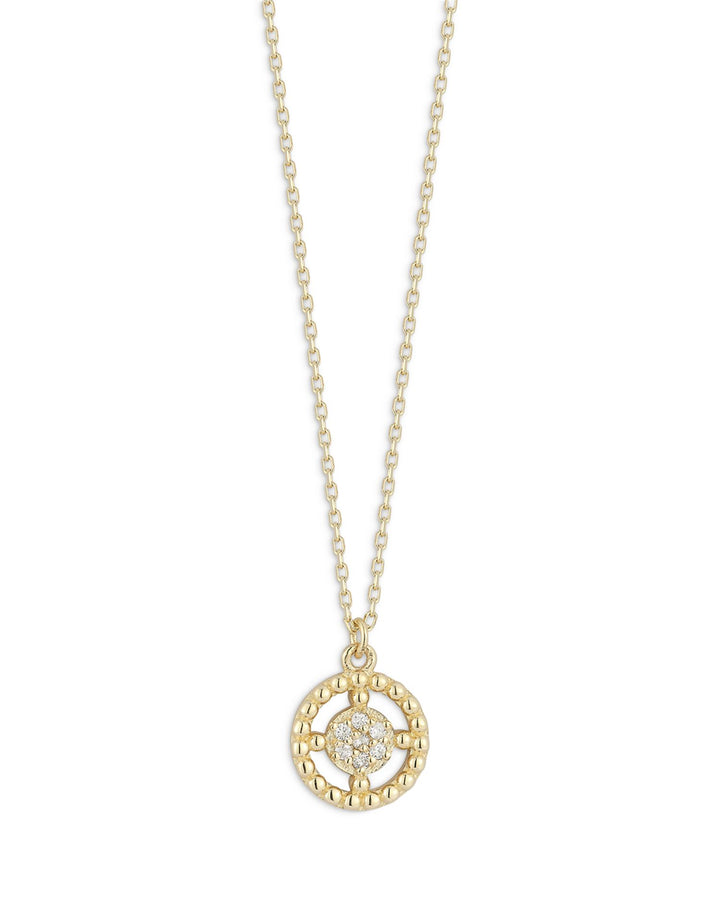 This 14K Yellow Gold Diamond Circle Necklace by Alberto Amati combines delicate sparkle with intricate design. A diamond cluster framed by a beaded circle makes this pendant necklace a refined and elegant choice.