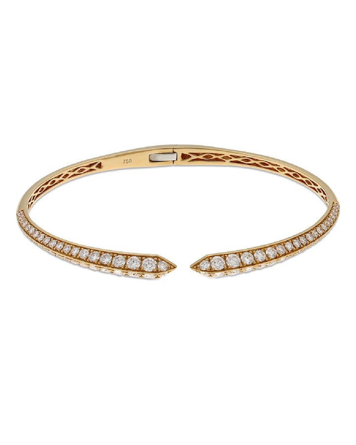 Handcrafted in 18K yellow gold with 2.34 carats of diamonds (H color, VS/SI clarity). Measures 2.2' in diameter with a hinge closure. All gemstones are treated to enhance beauty. All carat weights are approximate, with a variance of 0.05 ct.