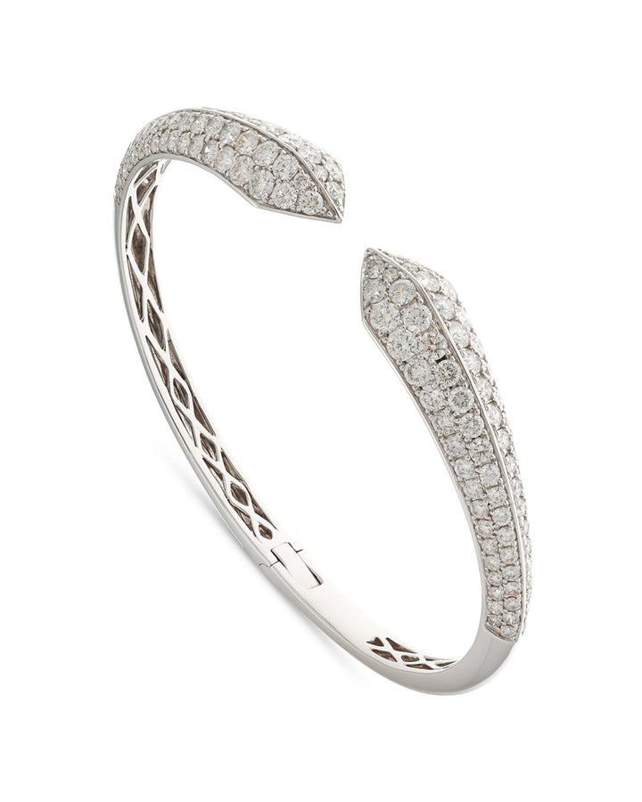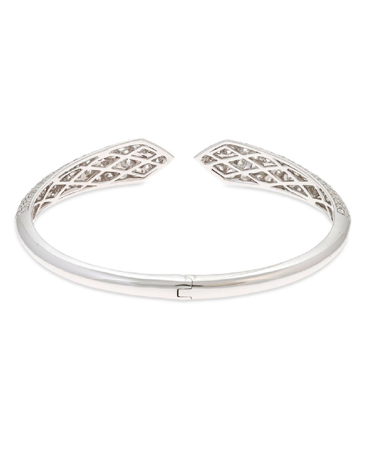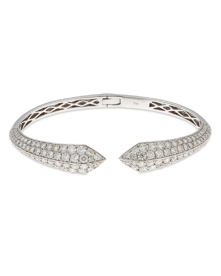 Handcrafted in 18K white gold with 5.49 carats of diamonds (H color, VS/SI clarity). Measures 2.2' in diameter with a hinge closure. All carat weights are approximate, with a variance of 0.05 ct. White gold is surface-coated with rhodium to enhance shine and may require replating.