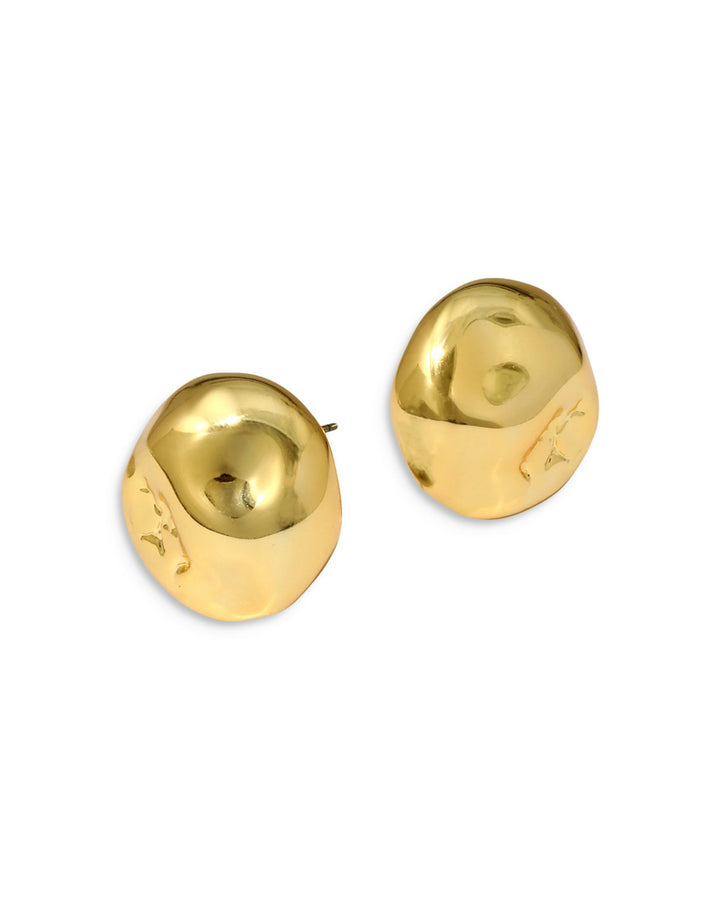 The Brut Sculptural Button Earrings by Alexis Bittar add a touch of modern elegance to any outfit. Their bold design and polished gold-plated finish make them versatile and timeless.