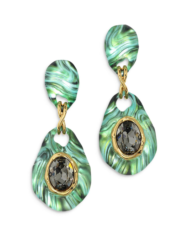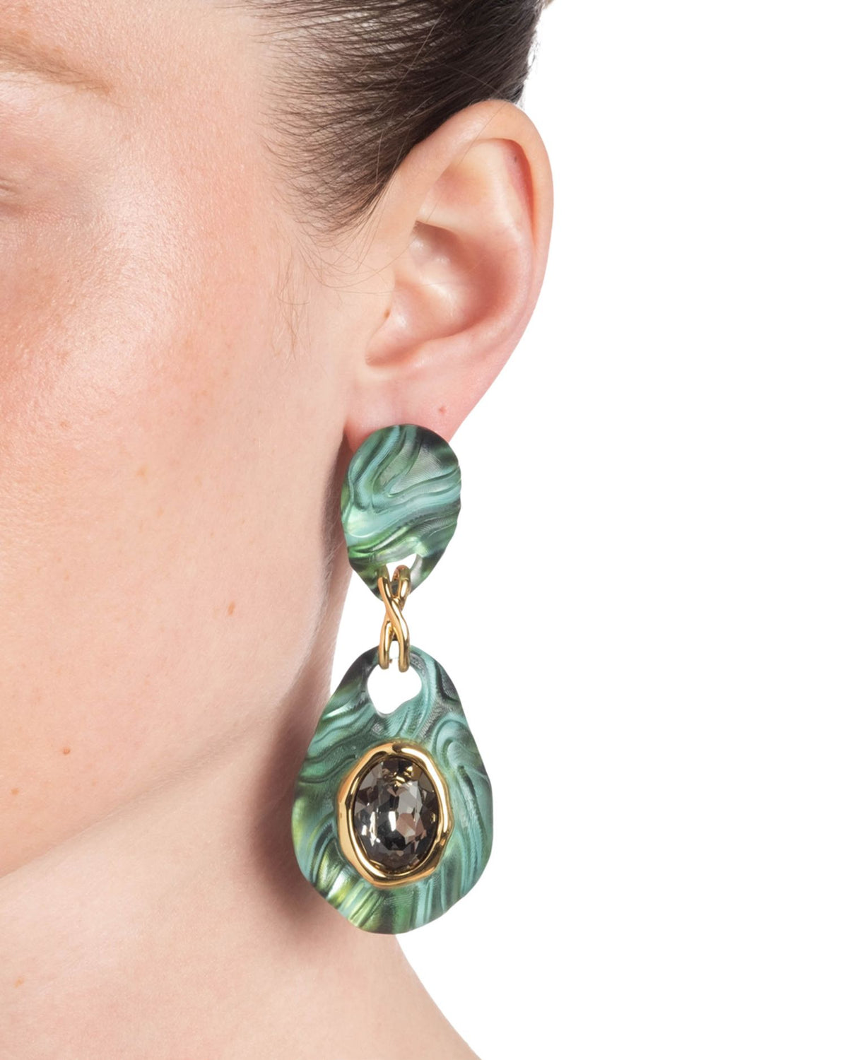 These Madera Crystal & Jet Green Drop Earrings by Alexis Bittar, from the Madera collection, showcase a harmonious blend of lucite and gold-plated elegance. The green hue of the crystals adds a vibrant touch, making them a standout piece.
