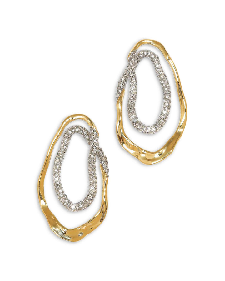 These Solanales Double Loop Earrings by Alexis Bittar showcase a dramatic double-loop design adorned with pavé-set crystals. Their bold structure and radiant gold plating make them a standout choice for evening glamour.