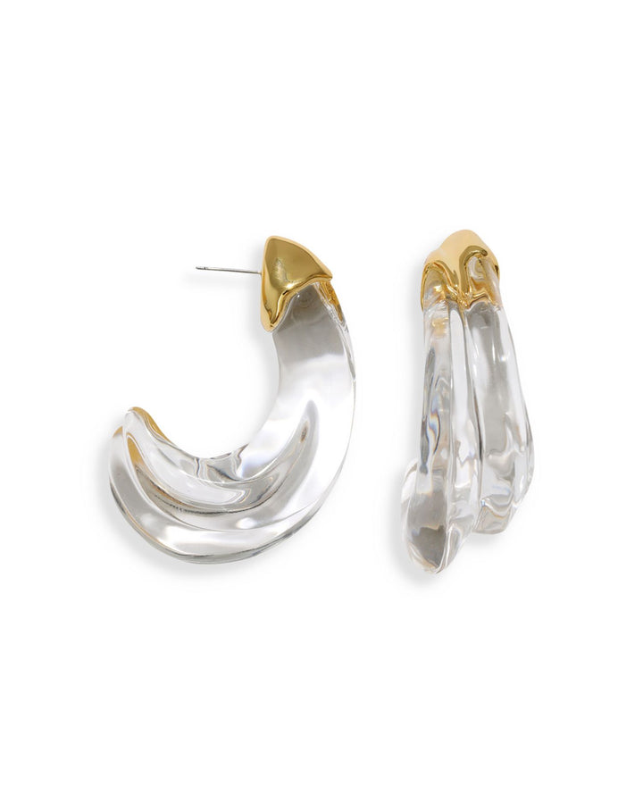These Liquid Lucite Large Wave Hoop Earrings by Alexis Bittar, from the Liquid collection, feature a bold wave-inspired silhouette. The fusion of lucite and 14K gold plating creates a striking contrast, making them perfect for statement looks.
