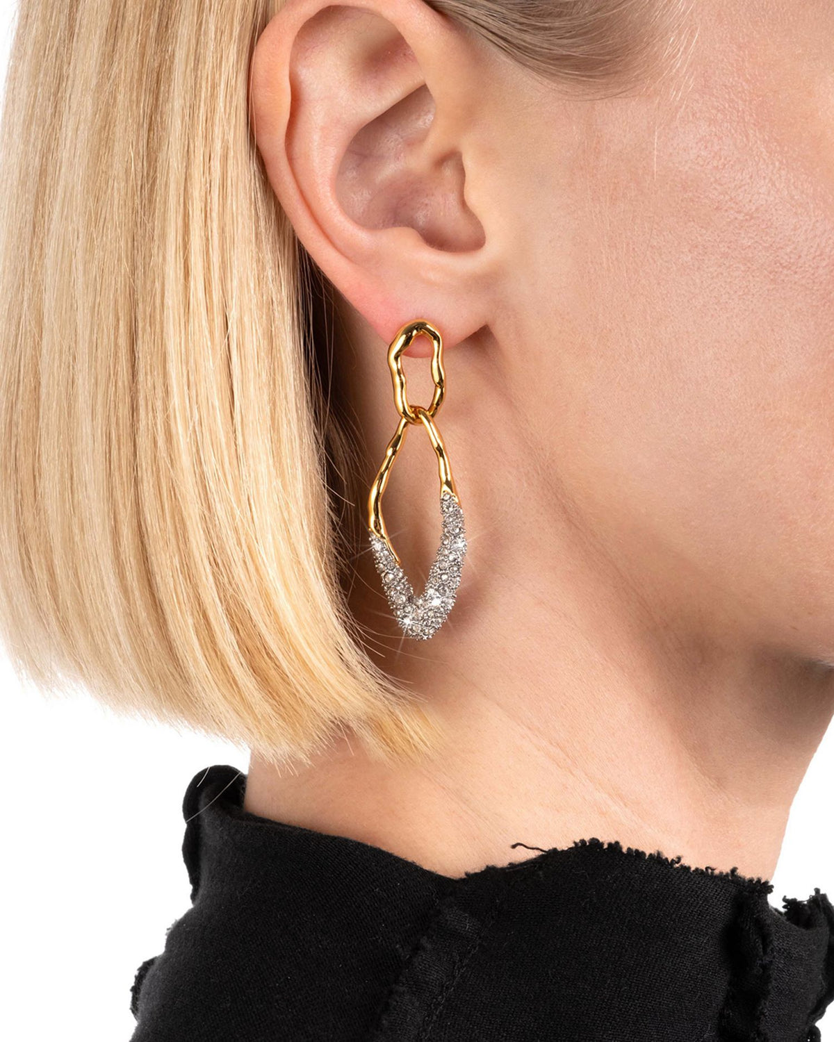 These Solanales Double Link Earrings by Alexis Bittar feature an elegant, interlocking design adorned with pavé-set crystals. The gold-plated finish enhances their refined, contemporary aesthetic, perfect for any occasion.