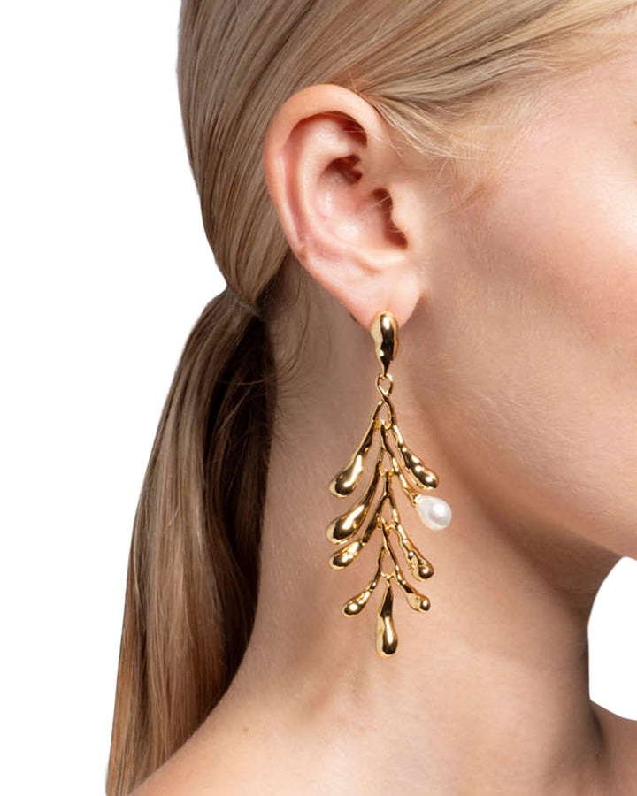 Crafted in 14K gold-plated brass with cultured freshwater pearls measuring 7mm x 11mm. Earrings measure 4.5'L x 1.3'W and feature post-back closures.