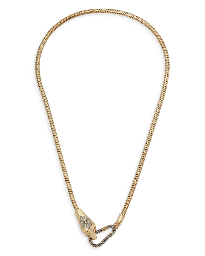 This Snake Head Strand Necklace by ALLSAINTS adds a bold, edgy touch to your accessories. The snake-head pendant, combined with gold-tone brass and glass crystals, creates a striking statement perfect for contemporary styling.