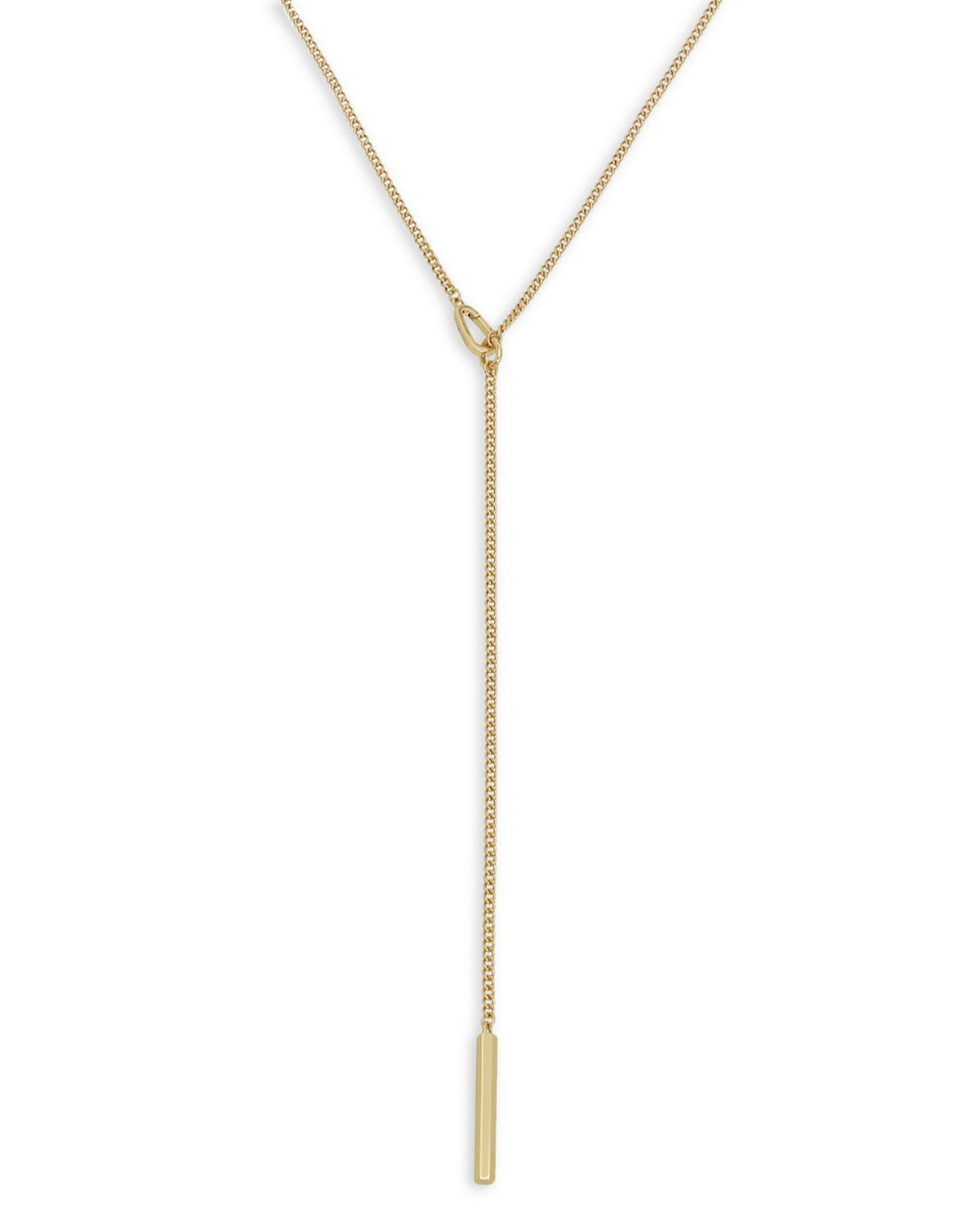 Made from gold-plated brass. Necklace measures 18"L with a 7.75"L drop. Secured with a carabiner clasp closure.