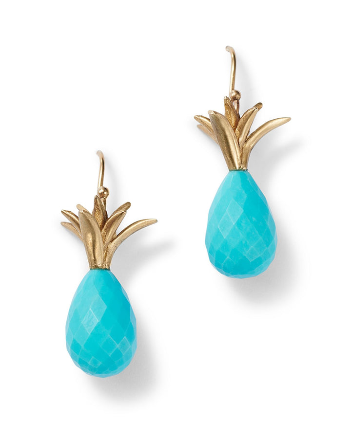 These 14K Yellow Gold Turquoise Pineapple Drop Earrings by Annette Ferdinandsen Design showcase a playful pineapple motif accented by a brilliantly faceted turquoise bead. The compact size and vibrant design make them a standout accessory.