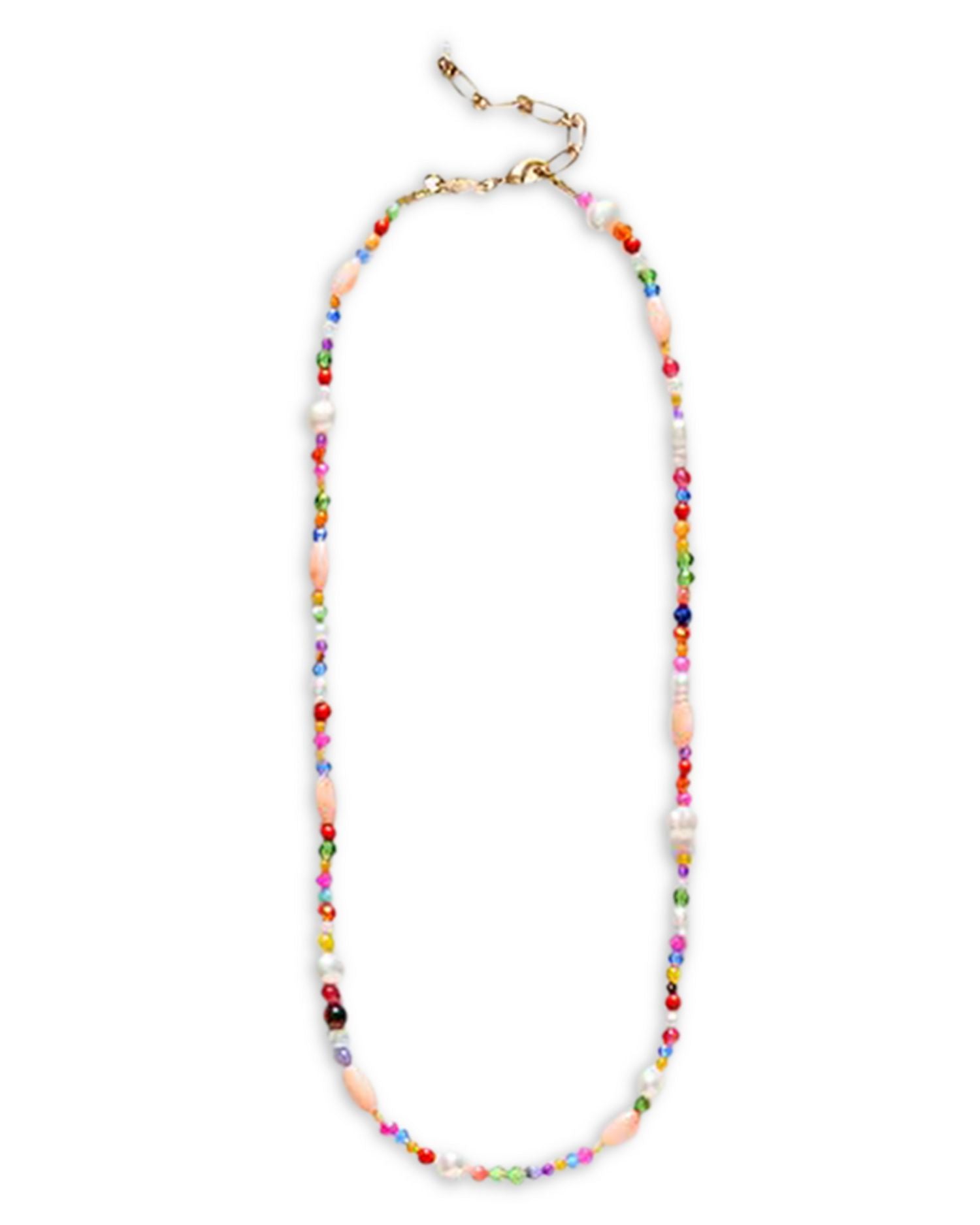 This Glamstone Mixed Bead Collar Necklace by Anni Lu, from the Glamstone collection, showcases a luxurious mix of gemstones including jade, sea bamboo, tiger’s eye, agate, and freshwater pearls. Its vibrant design is ideal for statement styling.