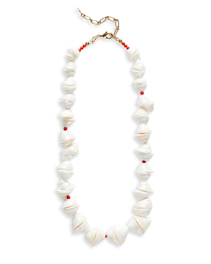 This Seashell Smiles Shell & Jasper Bead Necklace by Anni Lu, from the Seashell Smiles collection, combines natural shell and jasper beads for a chic, beach-inspired design. Its adjustable length makes it perfect for layering or wearing solo.