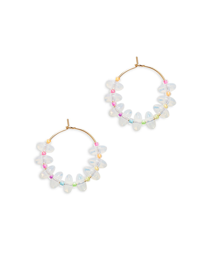 These Ice Ice Beaded Hoop Earrings by Anni Lu feature a delicate design with shimmering glass beads and opalite accents. Their gold-plated finish and lightweight feel make them a perfect accessory for everyday elegance.