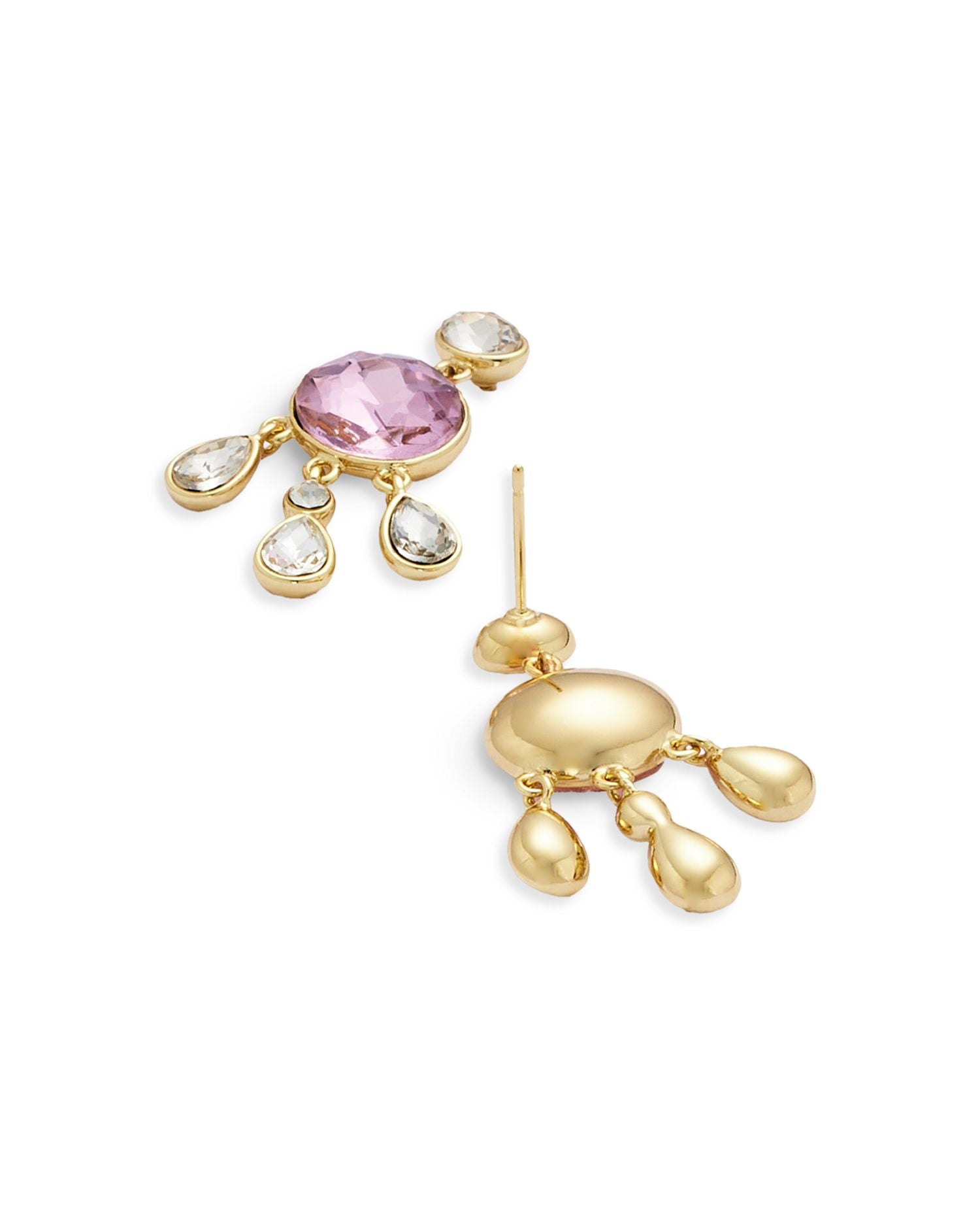 Made with 14K gold-plated metal, the earrings feature glass stones in clear and pink hues. The earrings measure 1.37' in length and come with post back closures for easy wear.