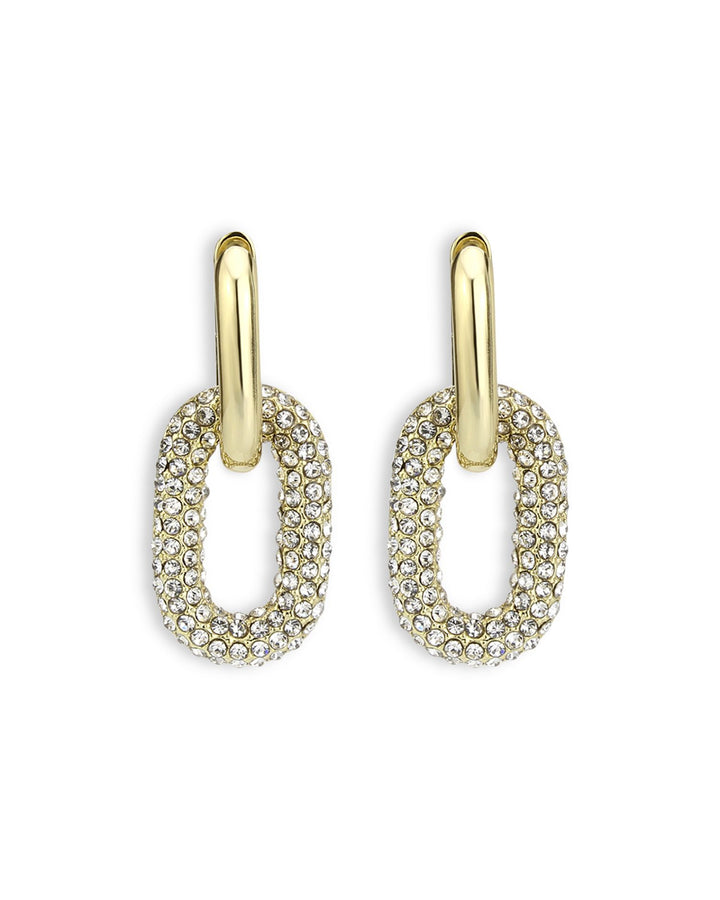 These Eno Pavé Link Drop Earrings by AQUA from the Eno collection feature a stunning blend of gold-tone metal, glass, and cubic zirconia. The 1.38'L drop design adds a graceful, elongated effect, making these earrings perfect for any occasion. The snap-post closure ensures secure wear while providing a stylish and elegant touch.