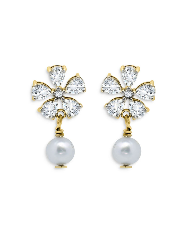 Cubic Zirconia Flower & Cultured Freshwater Pearl Drop Earrings in 18K Gold Plated Sterling Silver - Exclusive