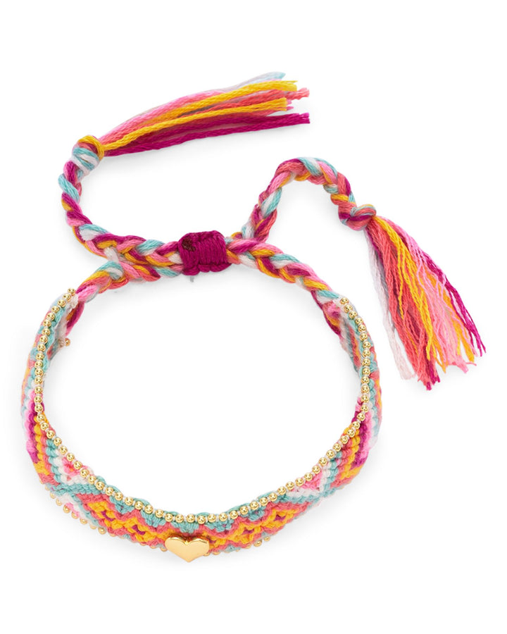 Made with 14K gold-plated metal and polyester, this bracelet has a 6.5' adjustable circumference and features a slide closure.