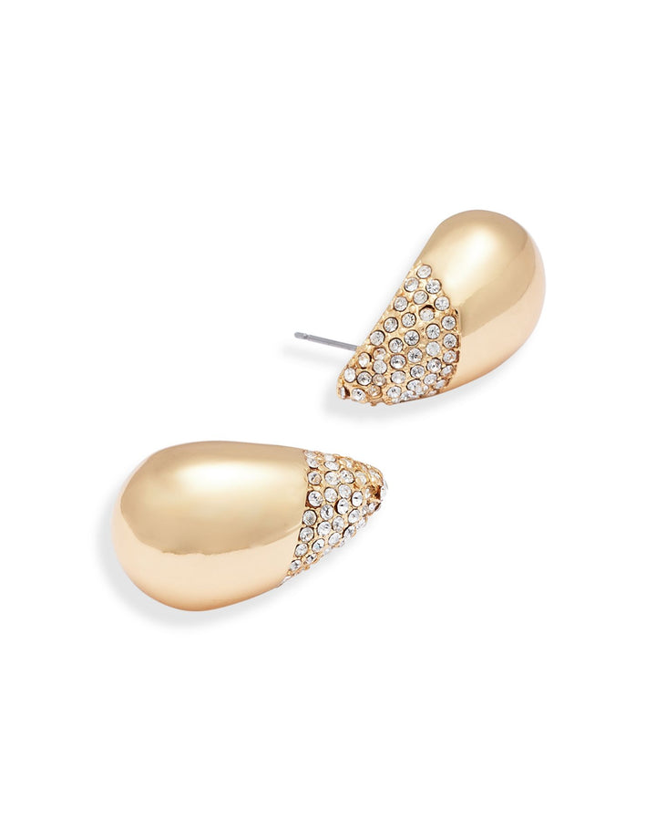 These Pavé Tear Shape Drop Earrings by AQUA offer a chic and modern design. The gold-tone setting is adorned with glass pavé, creating a refined yet sparkling effect. At 1.18'L, these earrings provide a graceful drop, making them perfect for both casual and formal occasions. The post back closure ensures secure wear.