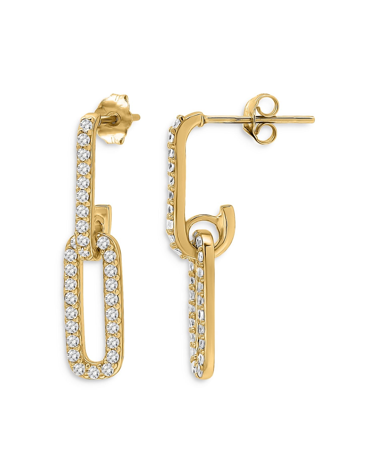 These Paperclip Drop Earrings by AQUA combine modern design with luxurious details. The 18K gold-plated sterling silver chain is adorned with sparkling cubic zirconia, creating a chic and refined look. At 1.125'L, these earrings provide an elegant drop, making them perfect for both everyday wear and evening events.