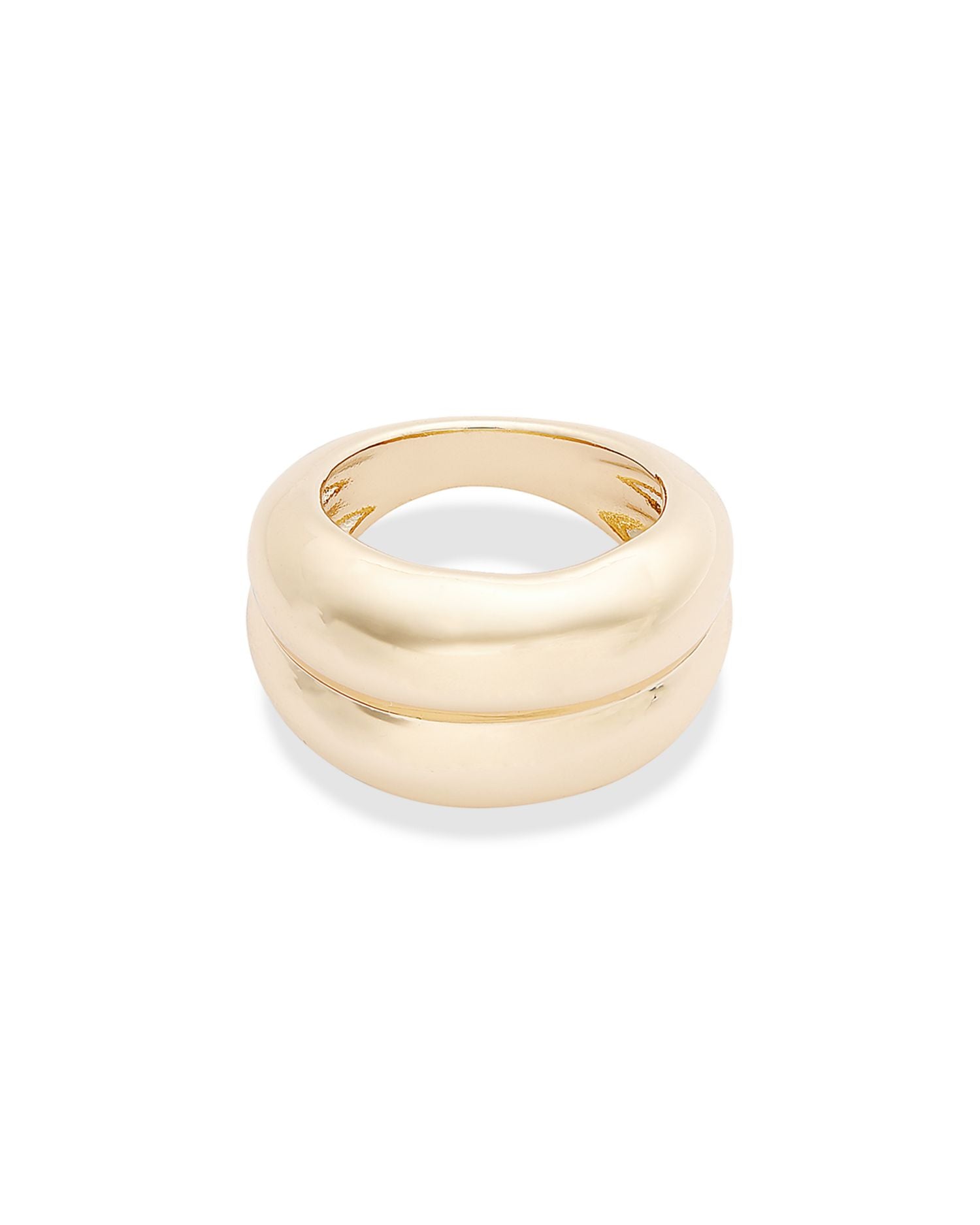 This Double Puff Band Ring by AQUA offers a bold and contemporary design. The gold-tone metal adds a warm, radiant finish, while the double puff band creates a statement look. This ring is perfect for making a bold, stylish statement on its own or stacking with other pieces for added impact.