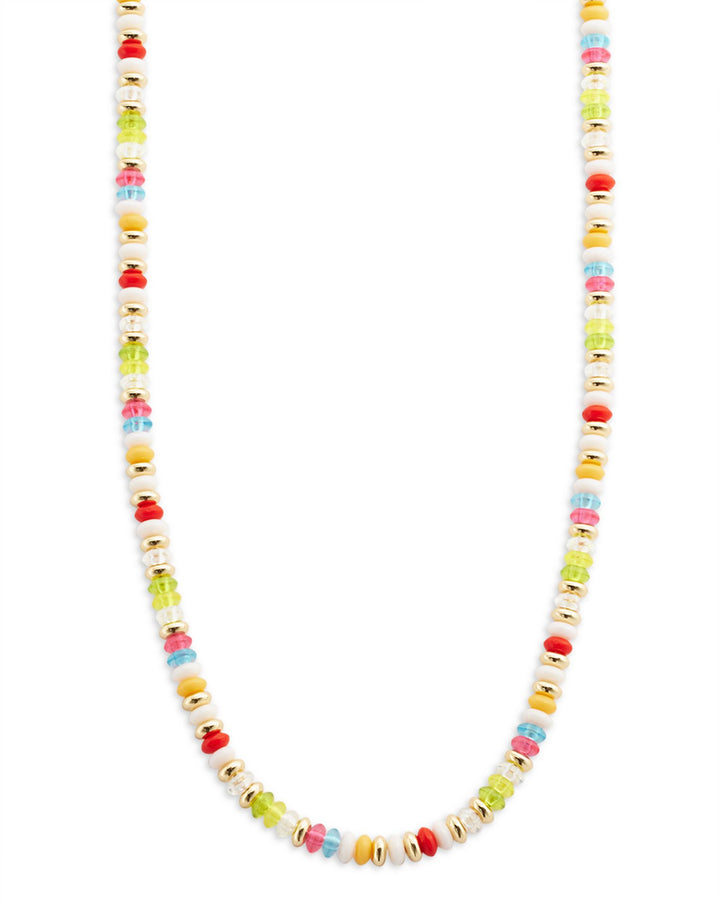Made with 14K gold-plated metal and glass beads. The necklace is adjustable from 16"-18" and features a lobster clasp closure.