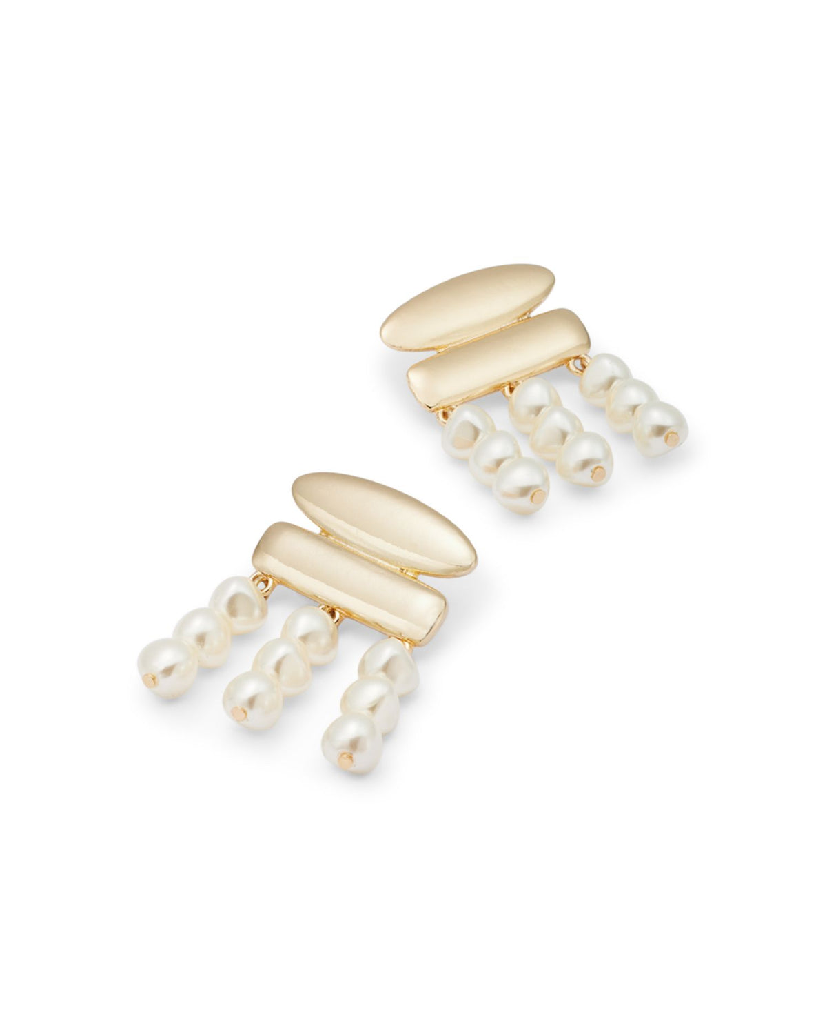 Crafted in 14K gold-plated brass with imitation pearls. Length: 1.75 inches. Post back closure. Made in the USA.