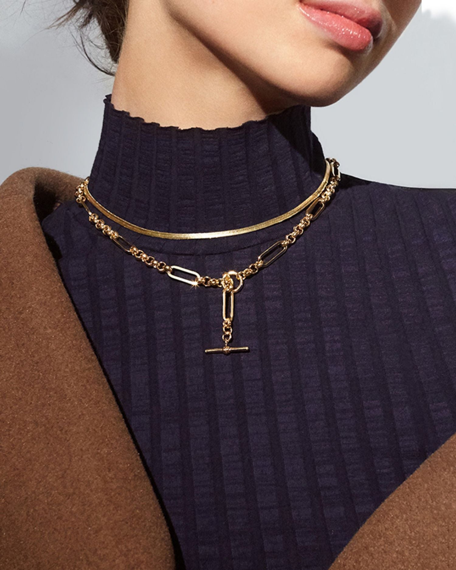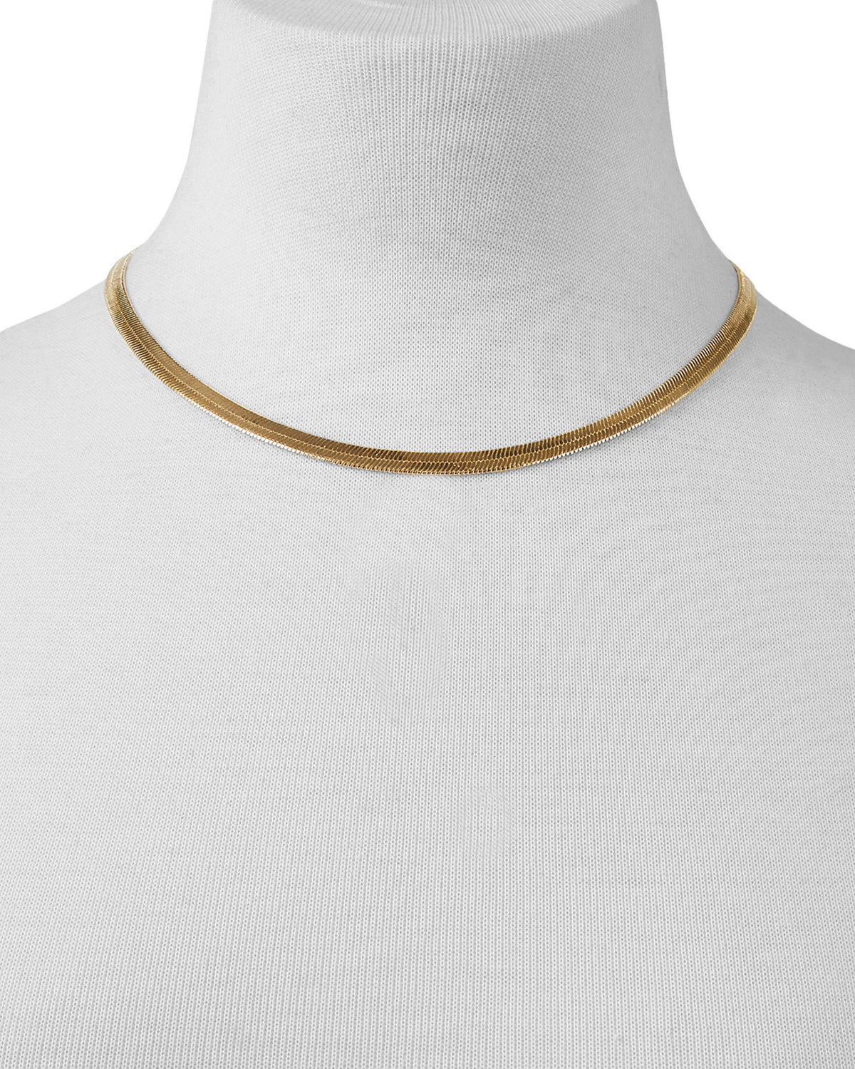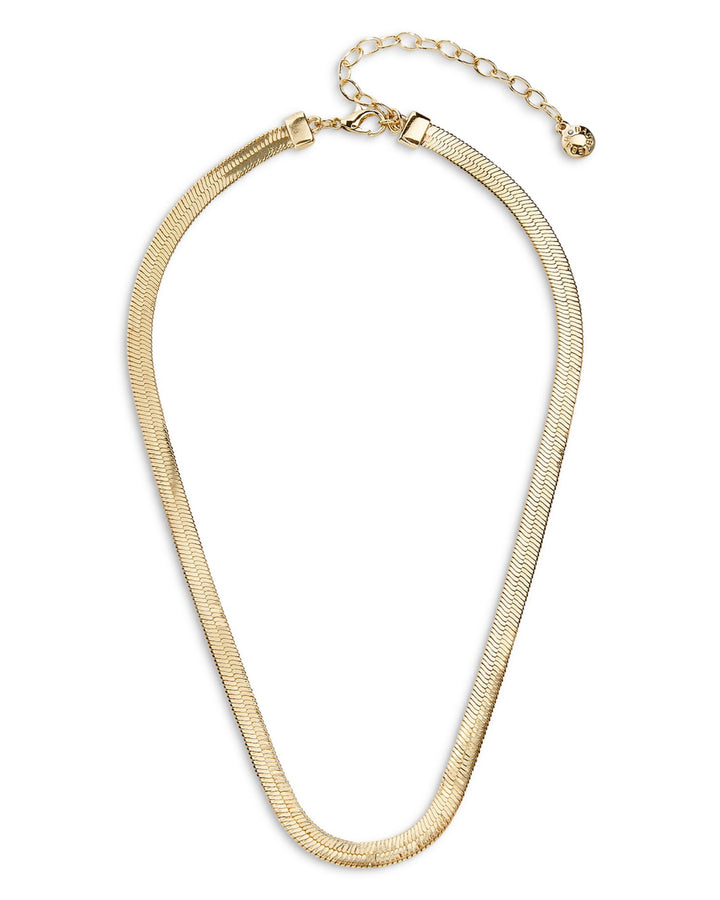 This Herringbone Chain Choker Necklace by BAUBLEBAR exudes timeless elegance with its sleek and polished herringbone design. Its adjustable length makes it perfect for layering or wearing as a bold standalone piece.