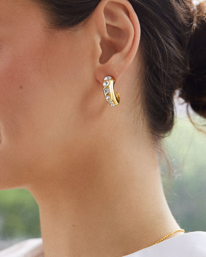 These Mckenzie Crystal C Hoop Earrings by BAUBLEBAR offer a chic and understated design. Part of the Mckenzie collection, their compact size and shimmering crystal accents make them versatile for everyday wear or subtle evening elegance.