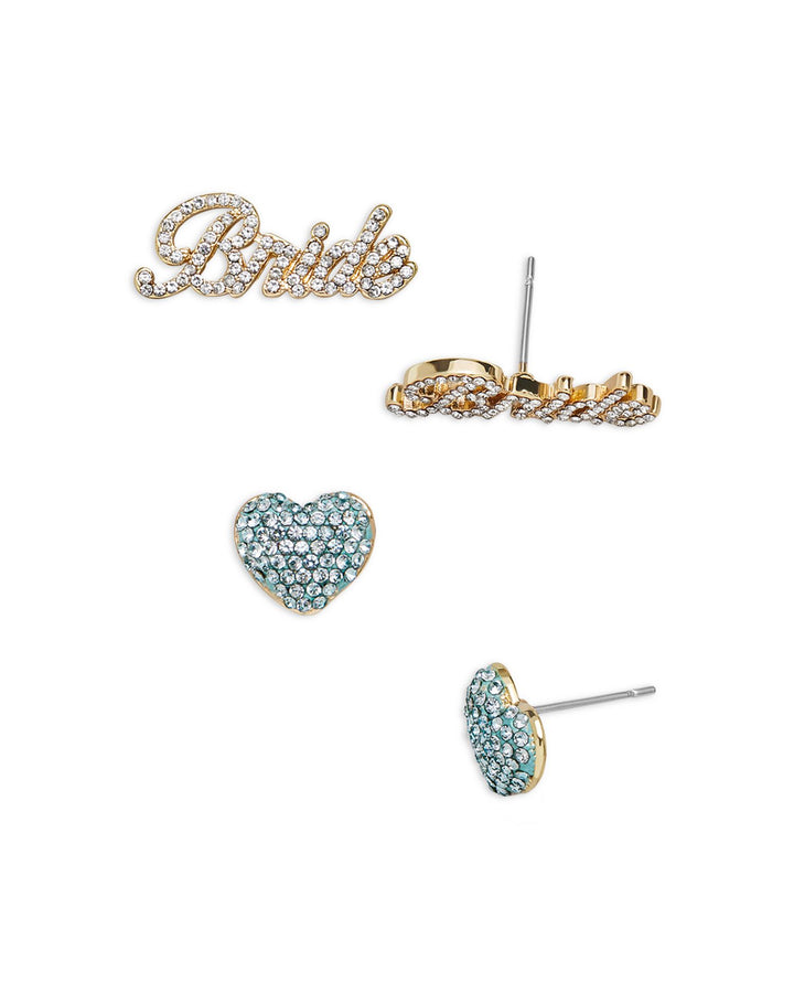 Something Blue Pavé Bride & Heart Stud Earrings in Gold Tone
