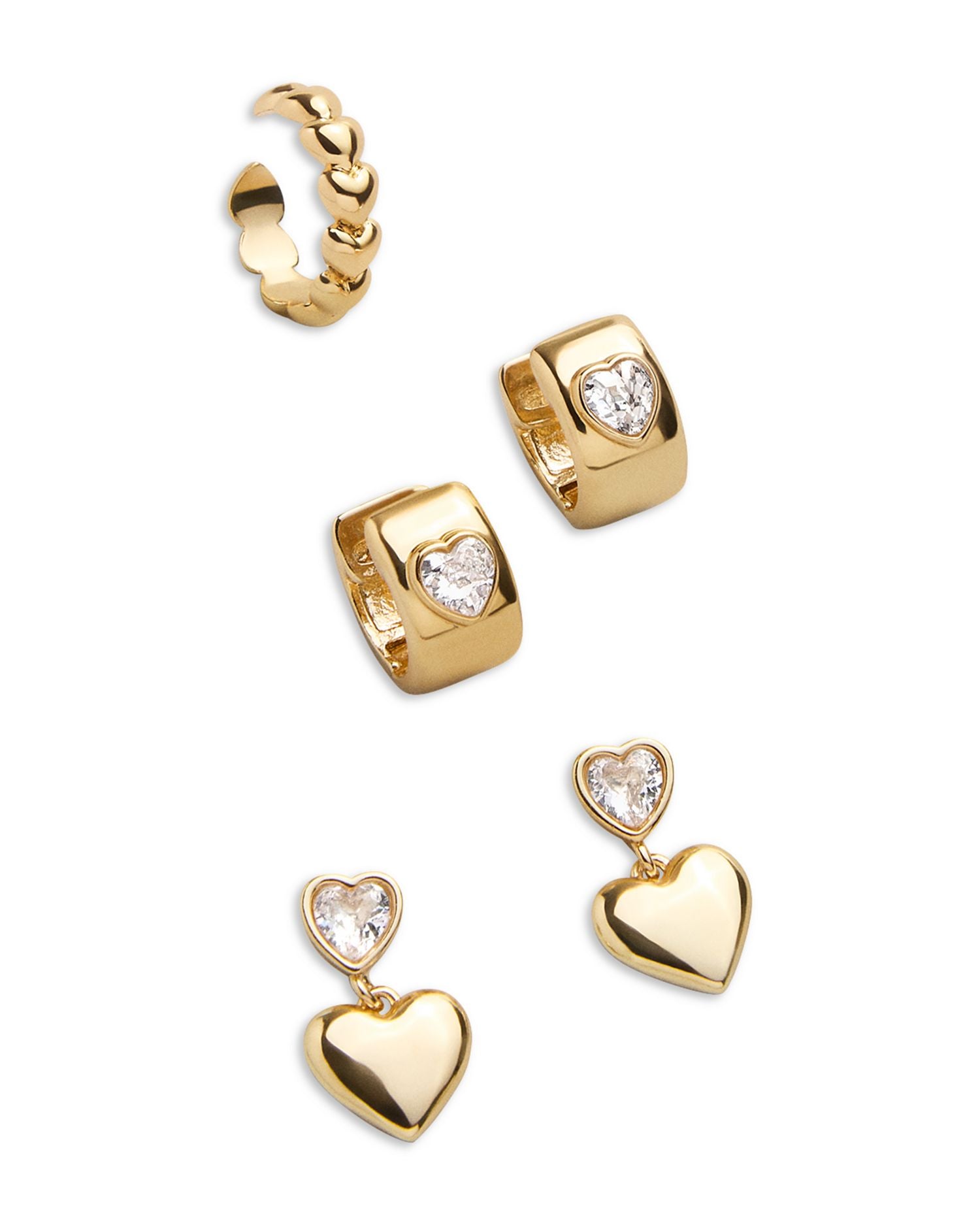 Alice Crystal Heart Drop, Huggie Hoop, & Single Cuff Earrings, Set of 3