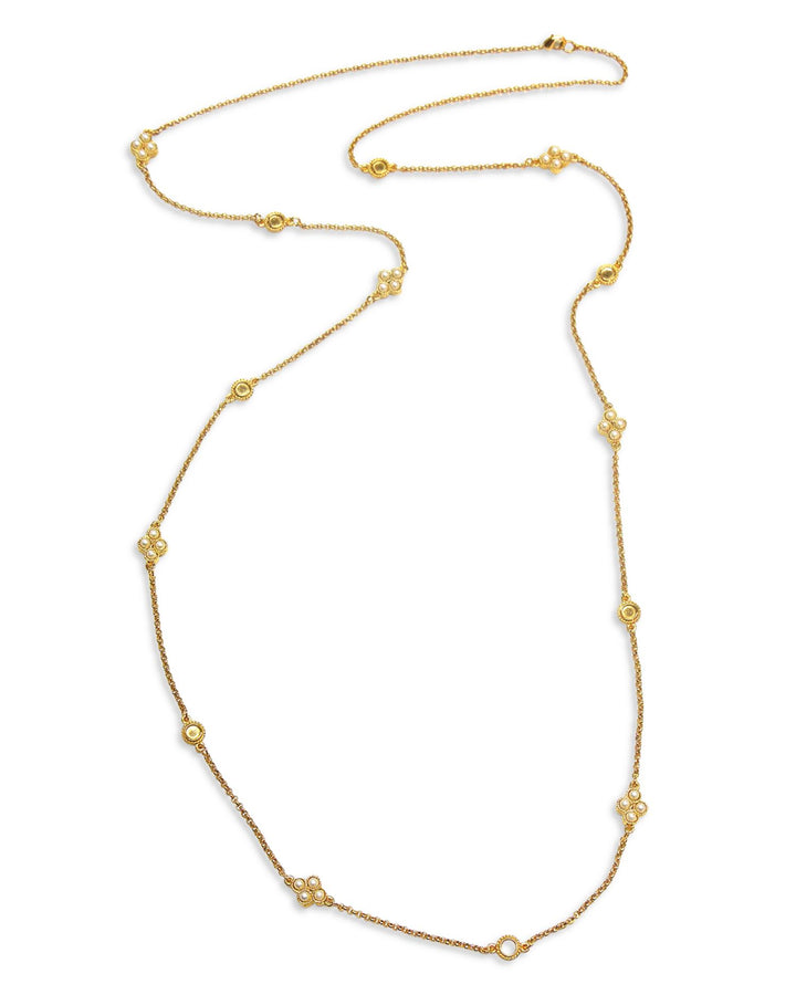 Handcrafted in 14K gold-plated metal with glass imitation pearls. Measures 45' in length. Secured with a lobster clasp closure. Made in the USA.