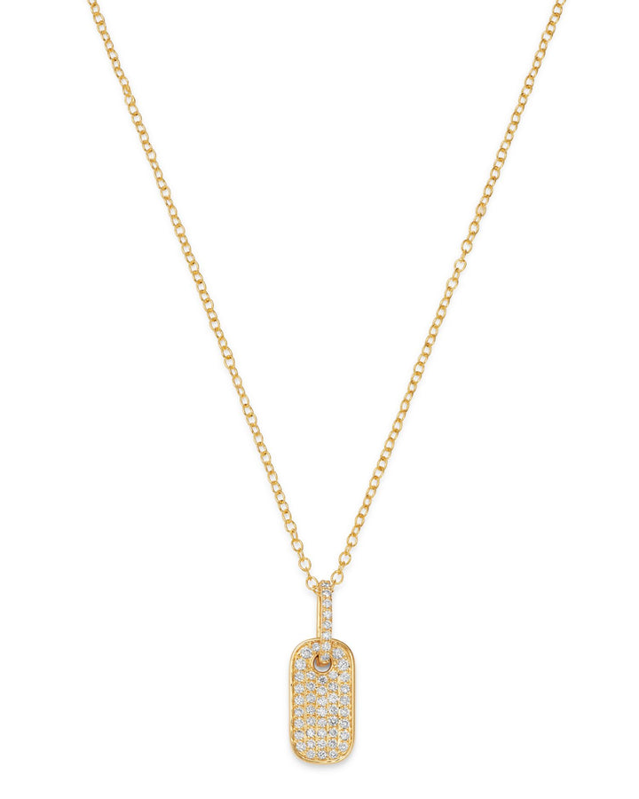 This Diamond Dog Tag Pendant Necklace by Bloomingdale's Fine Collection is a bold and sophisticated piece. Featuring diamond pavé detailing on a polished gold dog tag, it’s perfect for making a statement or adding sparkle to your everyday look.