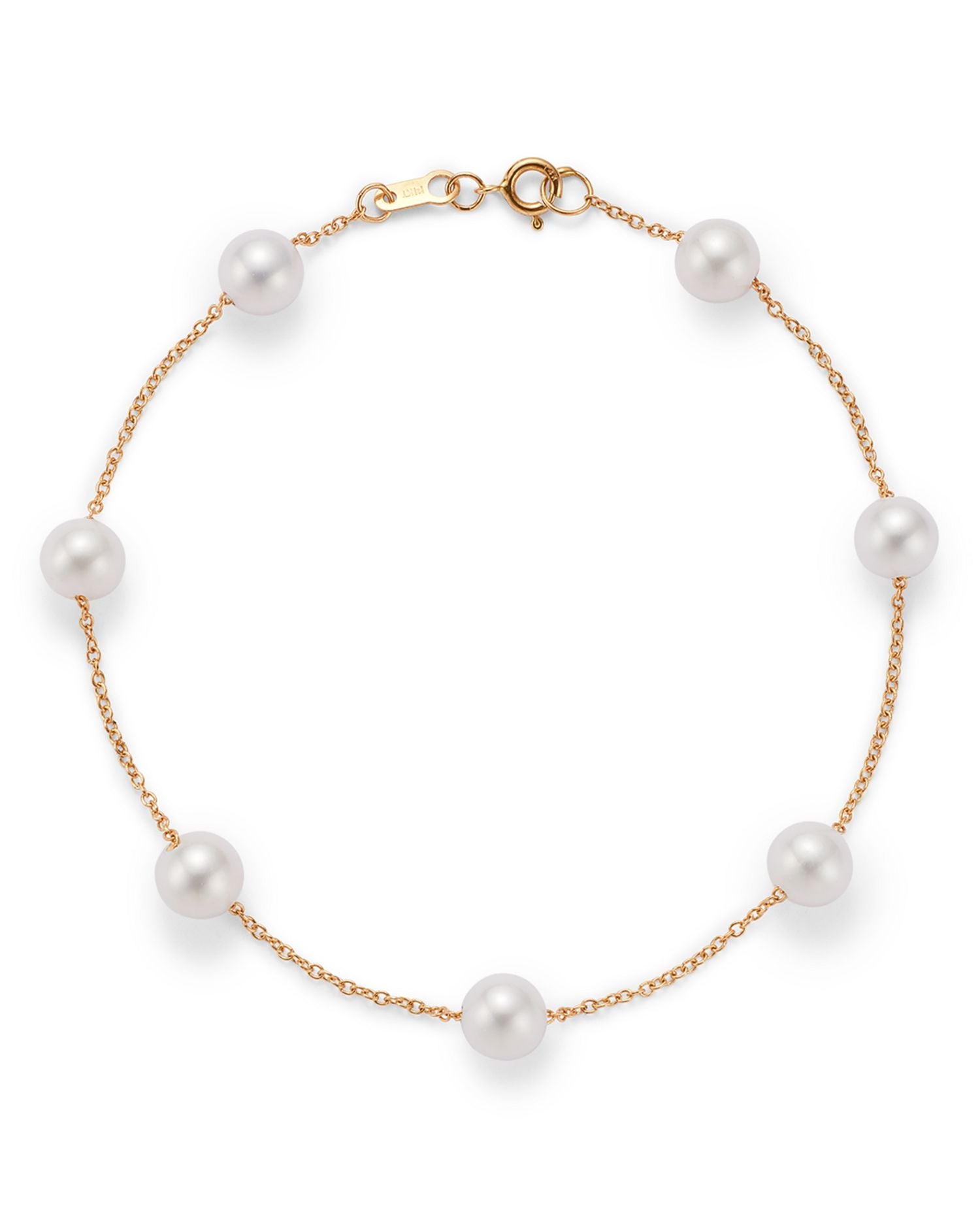 The Cultured Freshwater Pearl Station Bracelet in 14K Yellow Gold by Bloomingdale's Fine Collection features luminous 5.5-6mm cultured freshwater pearls spaced along a 14K yellow gold cable chain. The pearls add a touch of elegance to the 7.5'L bracelet, secured with a spring ring closure, making it perfect for both casual and formal wear.