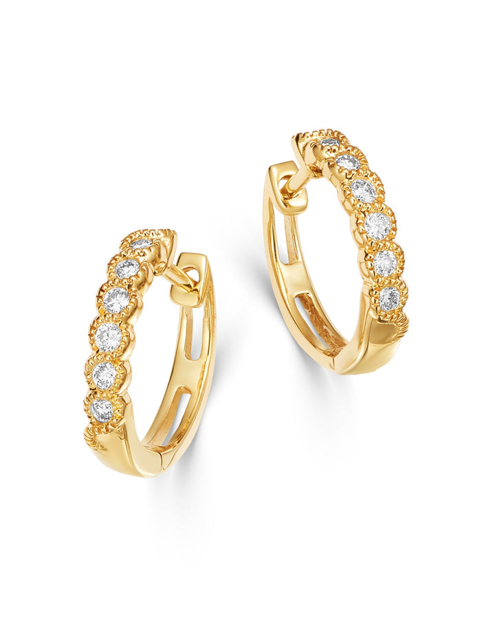 The Diamond Milgrain Huggie Hoop Earrings in 14K Yellow Gold, 0.10 ct. t.w. by Bloomingdale's Fine Collection are classic huggie hoops, illuminated by milgrain-set round diamonds (0.10 ct. t.w.; color/clarity: HI/I1I2). These earrings combine timeless elegance with modern sparkle, perfect for both day and night.