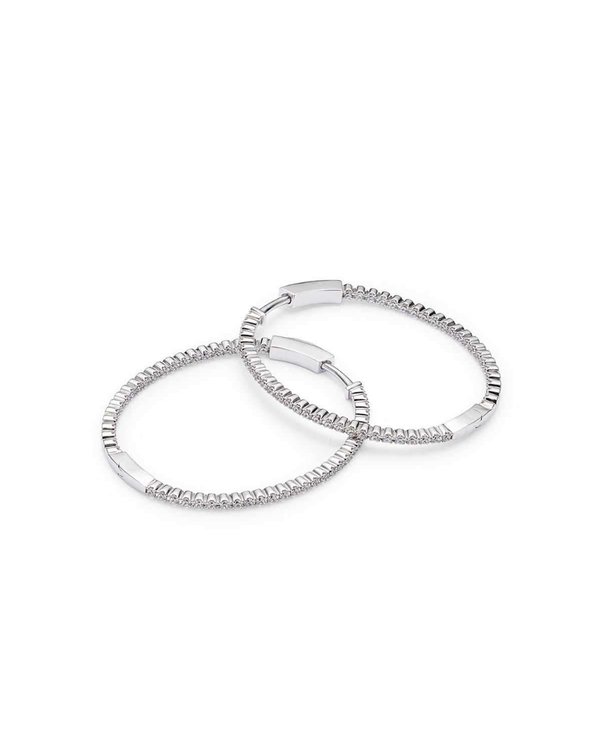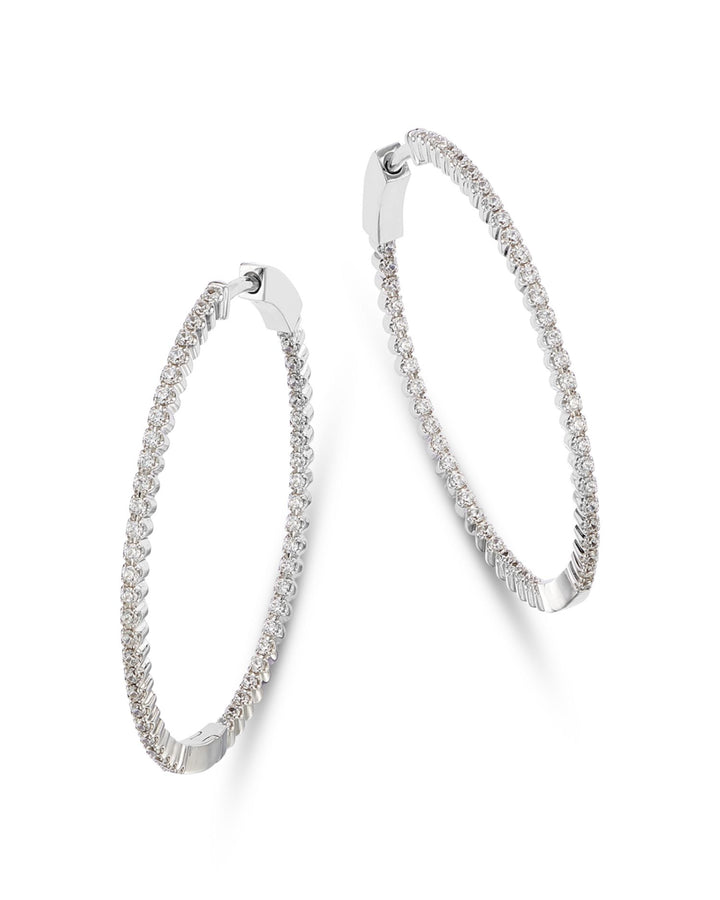 The Diamond Oval Inside Out Medium Hoop Earrings in 14K White Gold, 1.0 ct. t.w. by Bloomingdale's Fine Collection feature luxurious diamonds (1.0 ct. t.w.; color/clarity: HI/I1I2) set inside and outside the hoop, offering stunning sparkle. The 1.68' diameter and hinge hoop closure provide a secure and comfortable fit, making these earrings perfect for both day and evening wear.